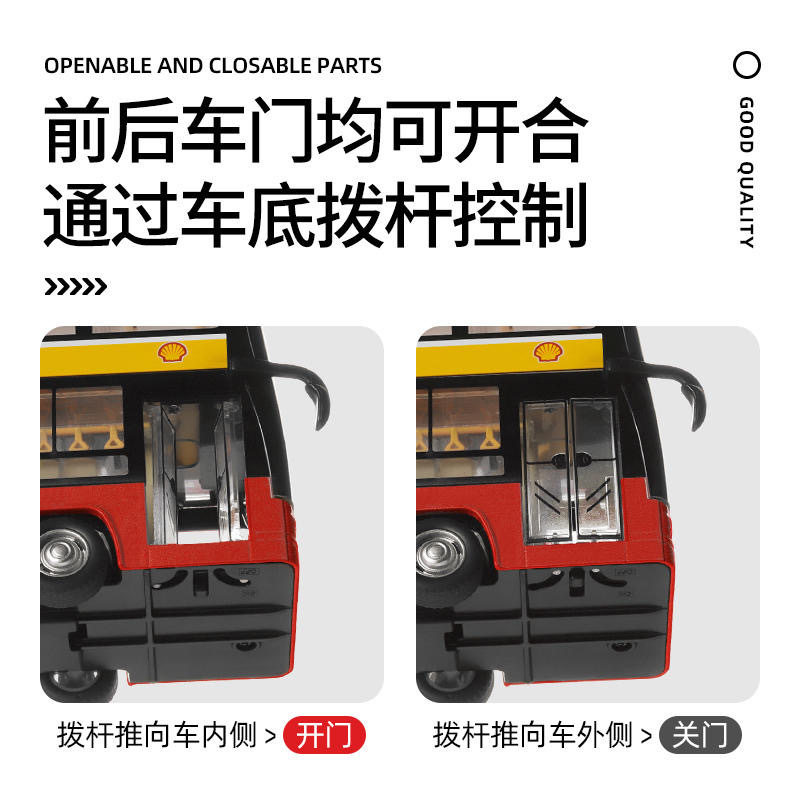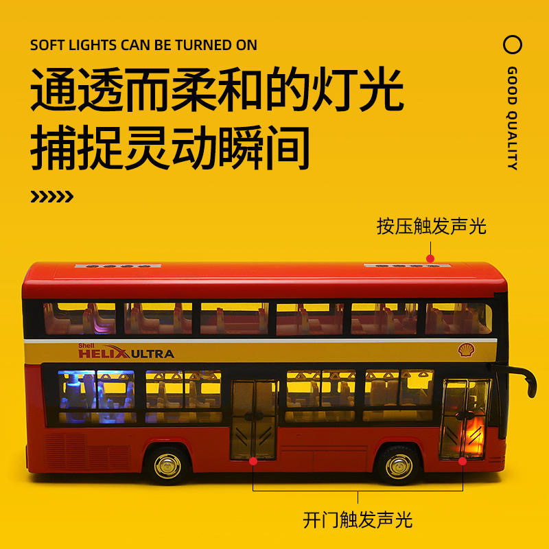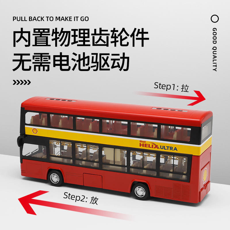 彩珀1/48合金双侧巴士模型观光车壳牌联名款公交车回力声光玩具车 - 欢欢乐园