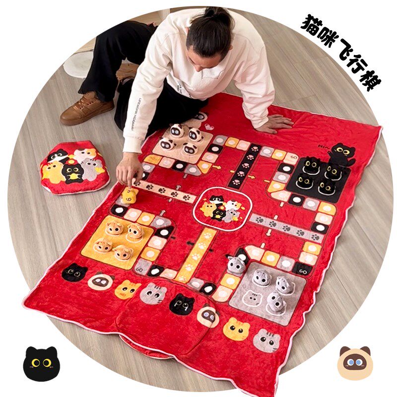 铭创优趣创意喵咪团o子猫飞行棋大毛毯趣味亲子互动抱枕毯子二合 - 花梅子优品2