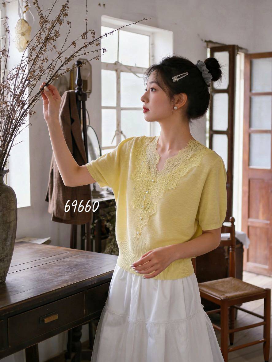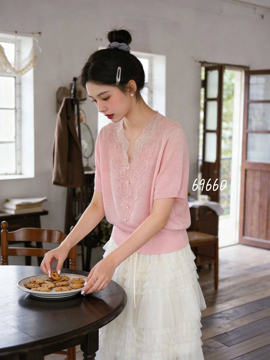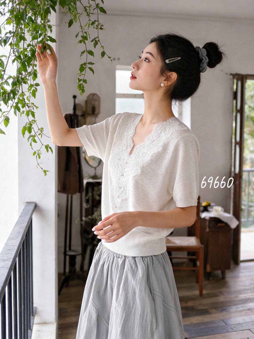 韩系V领蕾丝拼接短袖针织衫女26夏季新款显瘦气质洋气上衣M69660 - 莫可可服饰
