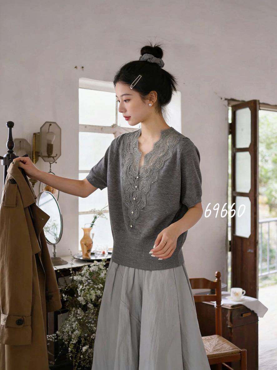 您的位置:安康生态农业开发平台  >   >  韩系V领蕾丝拼接短袖针织衫女26夏季新款显瘦气质洋气上衣M69660