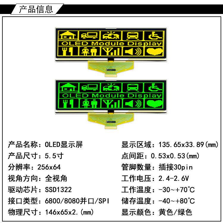 5.5寸OLED工业显示屏分辨率256x64插接30PIN驱动SSD1322屏5.5OLED - 束金商贸城