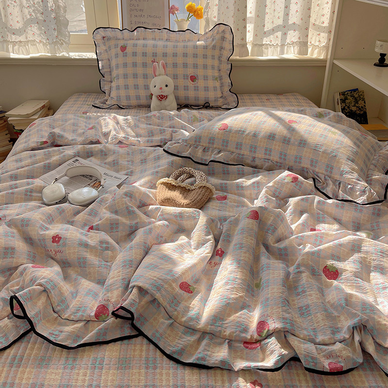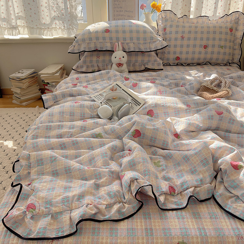 法式花边格子草莓水洗棉夏凉被四件套床盖款空调被单双人宿舍夏被 - 时光锦家居纺