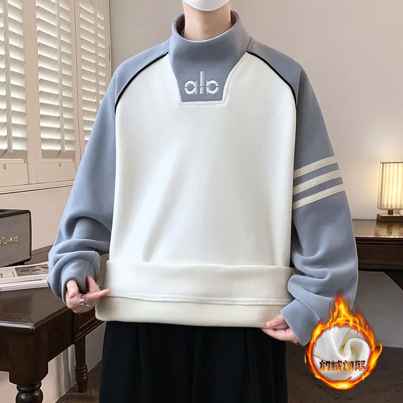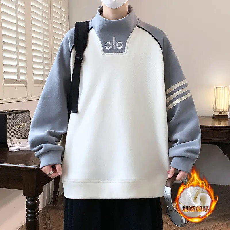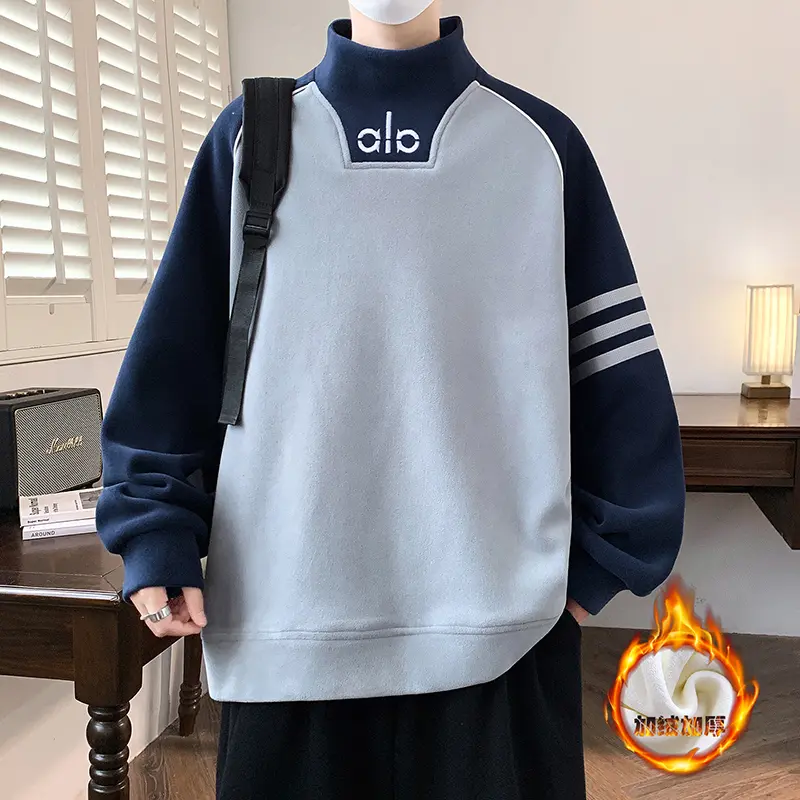 TPRS男装加绒加厚半高领拼色卫衣潮牌个字母设计宽松百搭男生上衣 - 金牌十九年老店