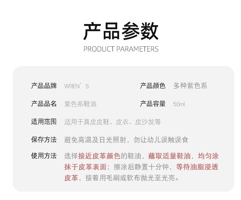 您的位置:安康生态农业开发平台  >   >  Wren's进口紫色鞋油深紫红色皮鞋油皮衣皮包皮鞋修补色真皮保养油