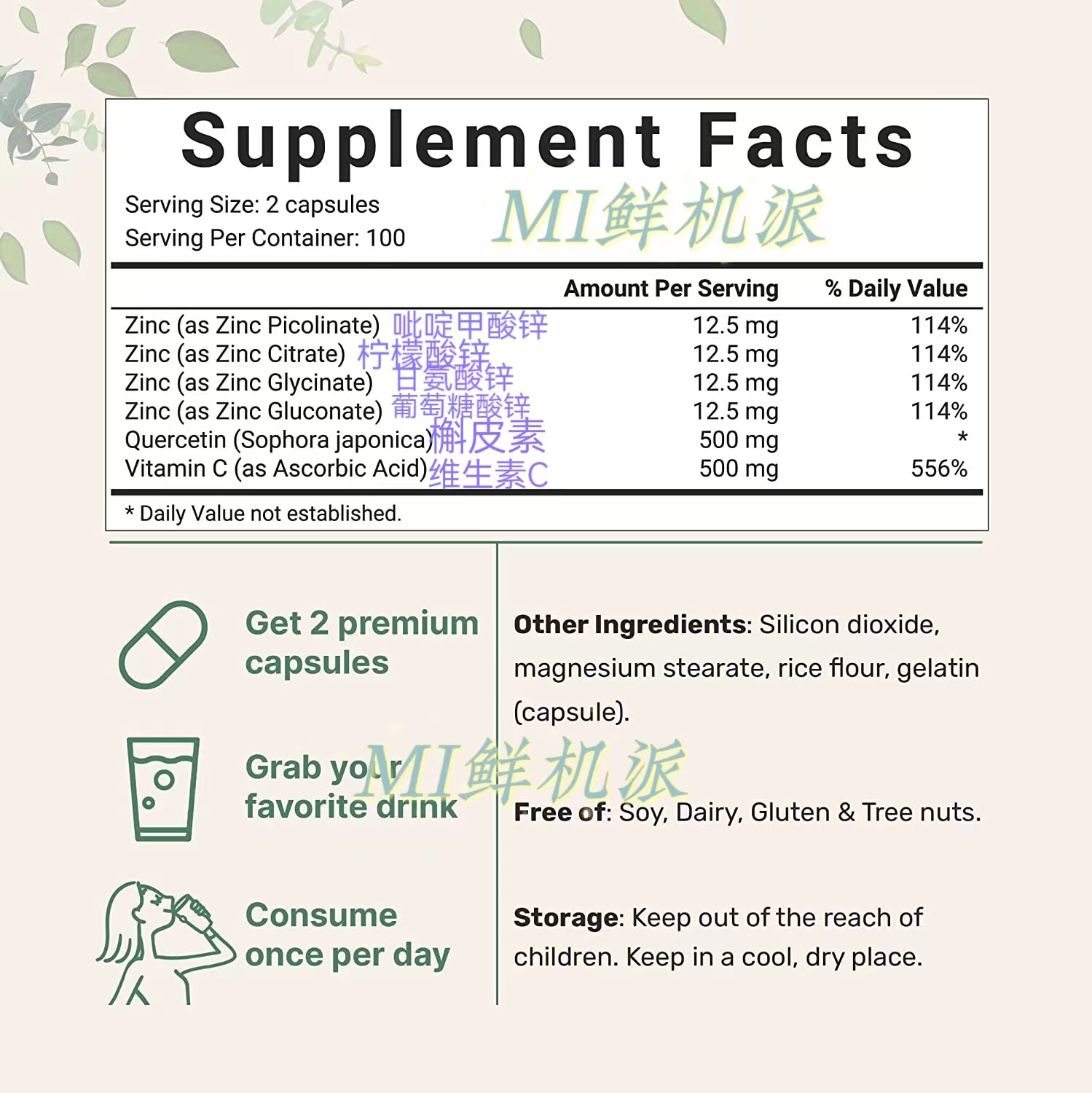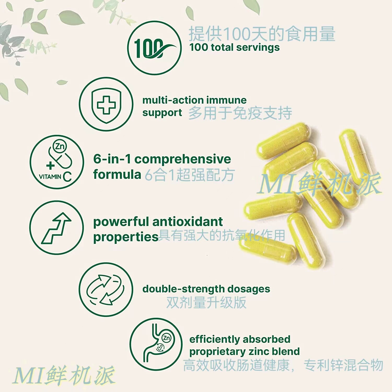 美国Micro Ingredients锌槲皮素维生素C胶囊6合1呼吸免疫系统健康 - MI鲜机派