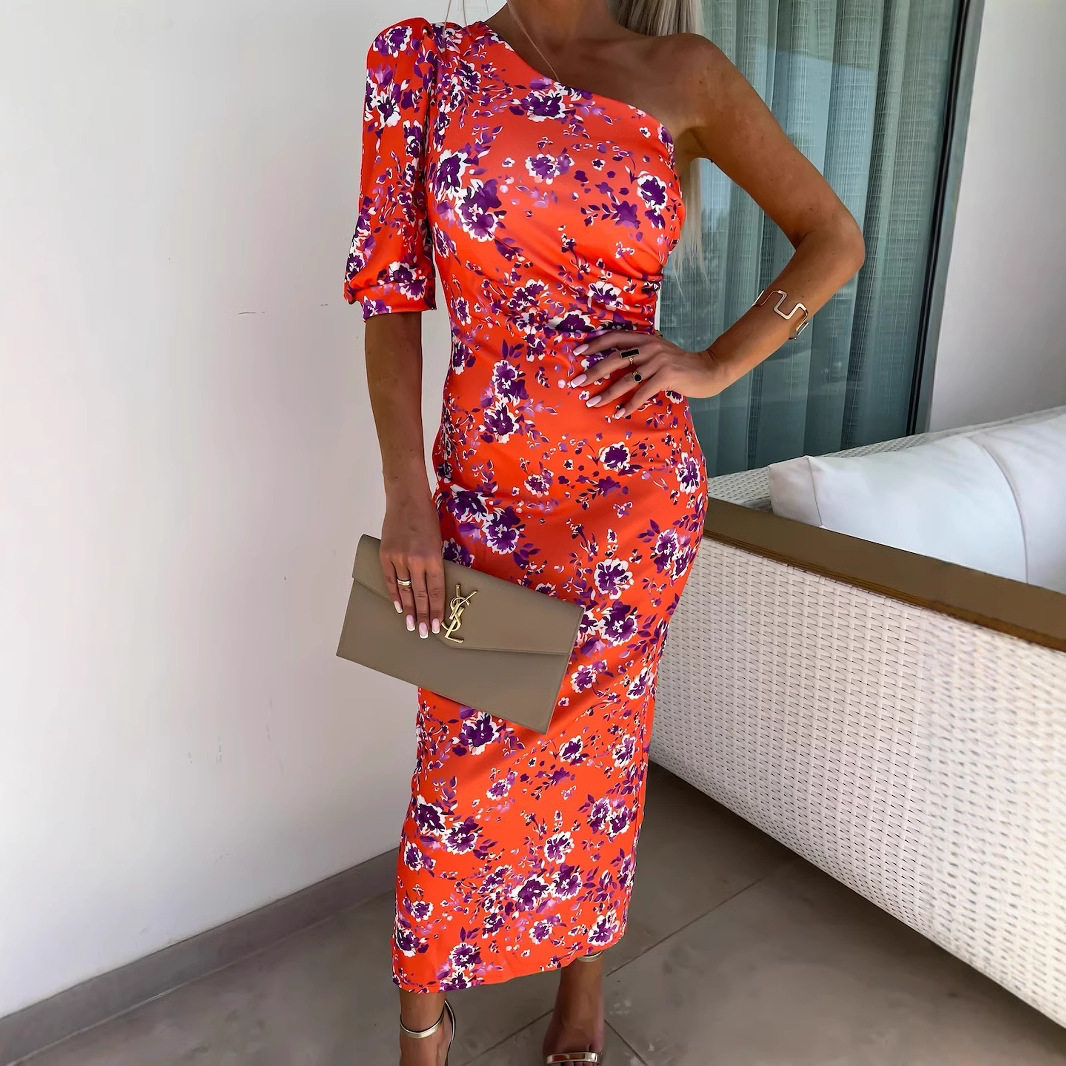 Women slanted shoulder printed bag hip slit dress long skirt - 折扣鞋服大卖场