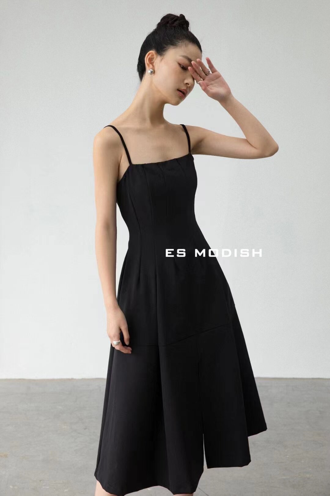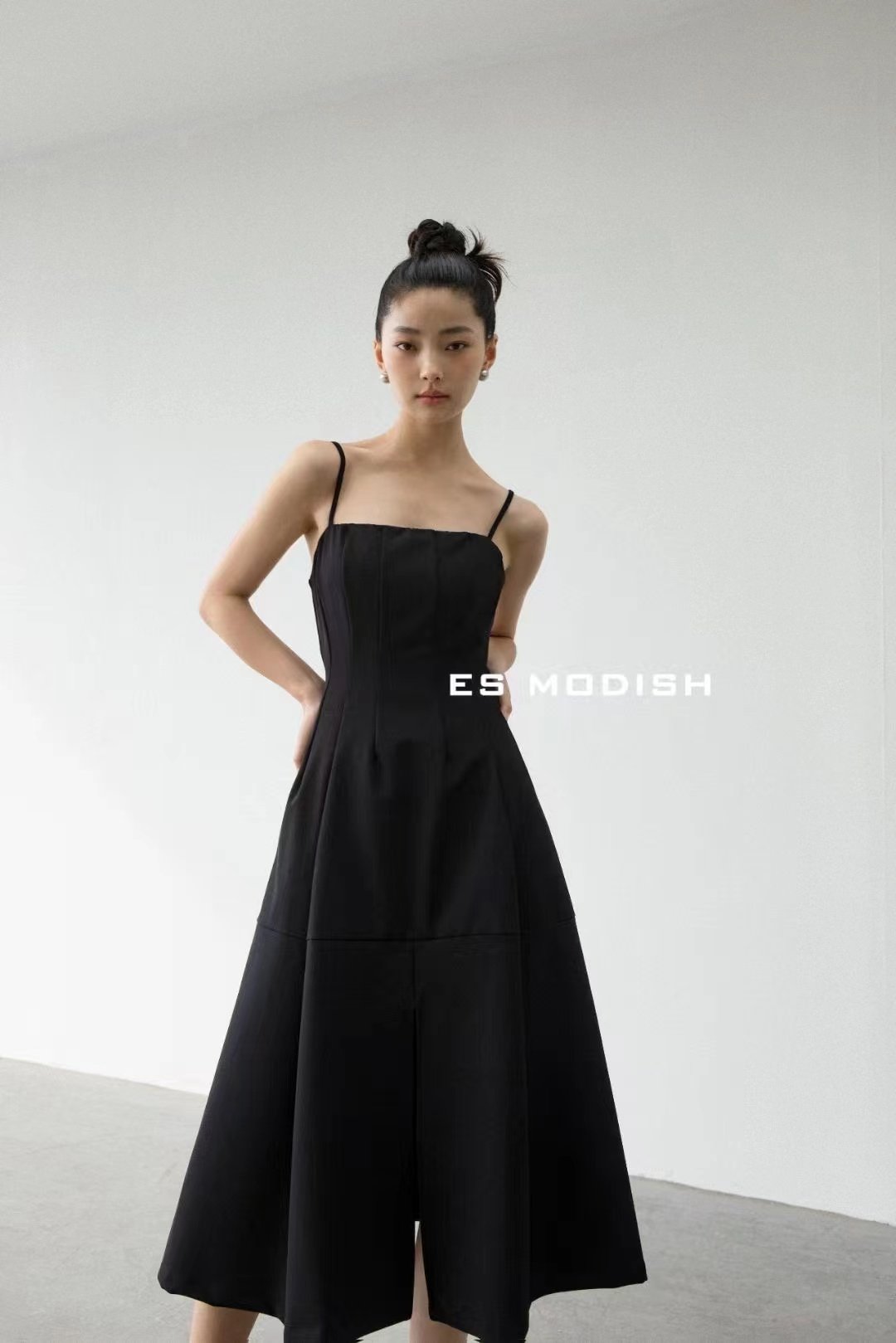 ES MODISH春夏1543黑色吊带连衣裙女赫本风收腰显瘦A字开叉中长裙 - 妙妙轻奢欧韩服饰