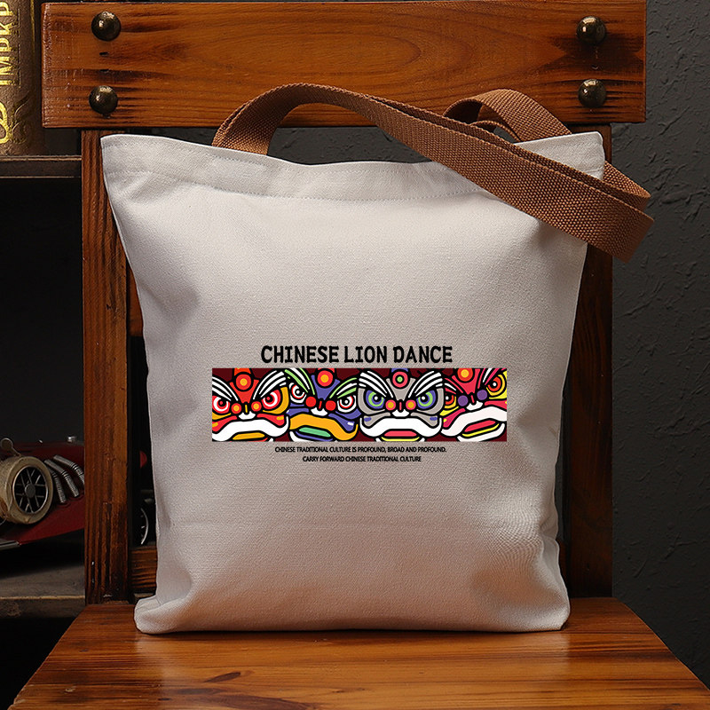 中国舞狮国潮印花复古帆布袋大容量上班通勤手提袋环保购物单肩包 - 不二创意馆