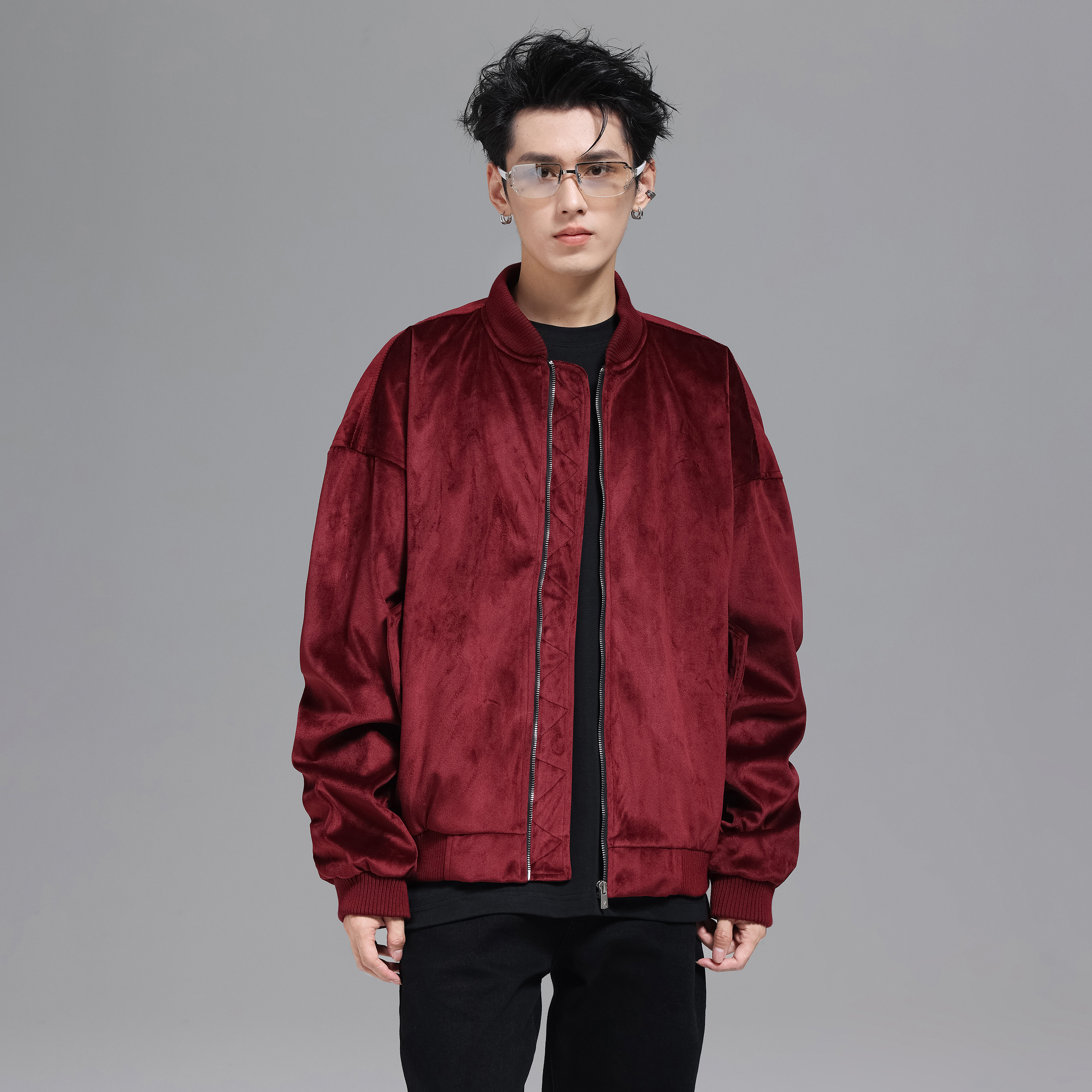 UNKNOWTAL 丝绒手臂褶皱拉链飞行夹克宽松外套国潮牌Clean fit - UNKNOWTAL