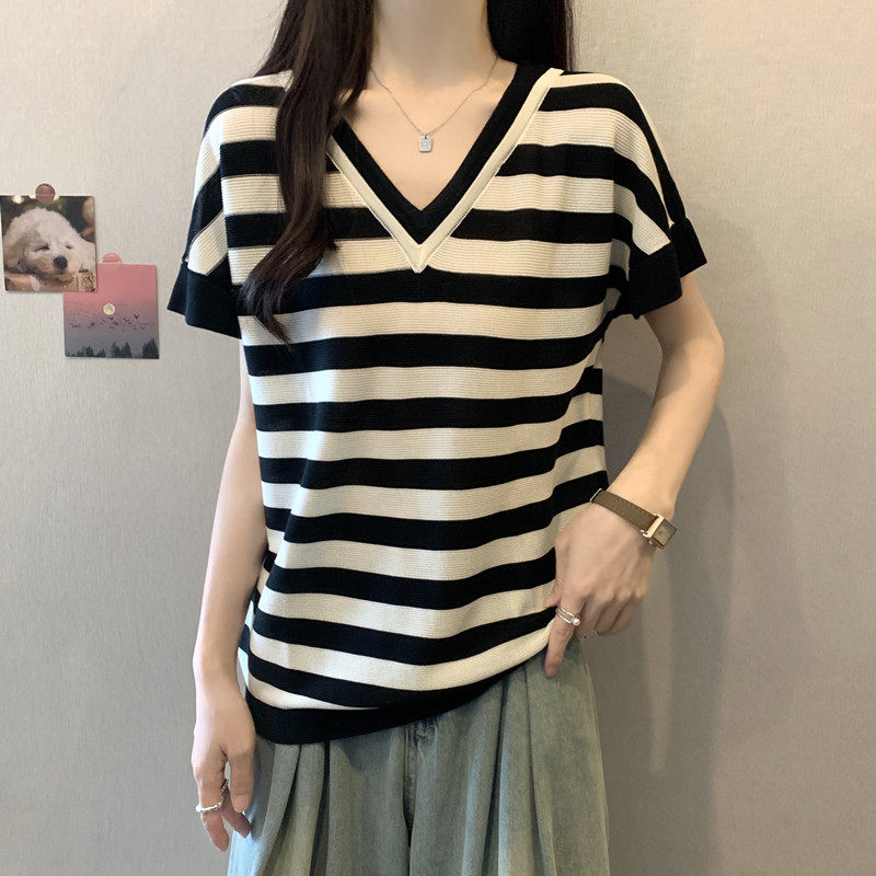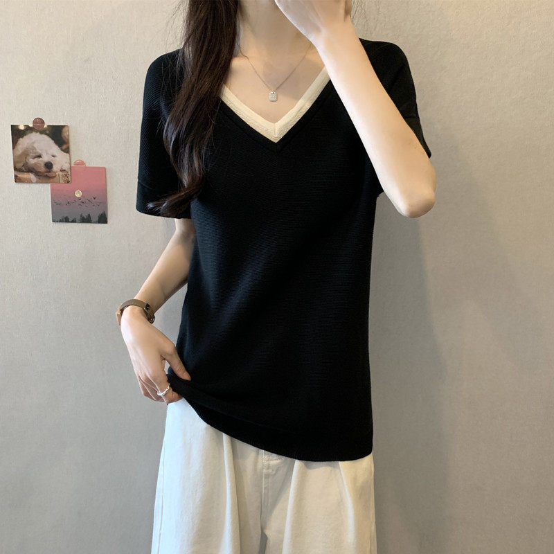 实拍胖妹妹夏装大码女装假两件V领短袖T恤显瘦宽松减龄冰丝上衣 - 衣身清爽时尚女装