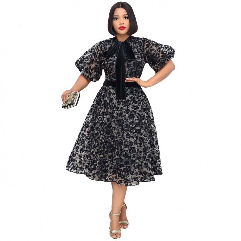 Women's flocking mesh lace dress立领黑色植绒网纱蕾丝连衣裙女 - 陌色阳光家居