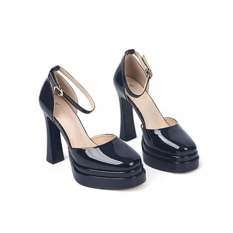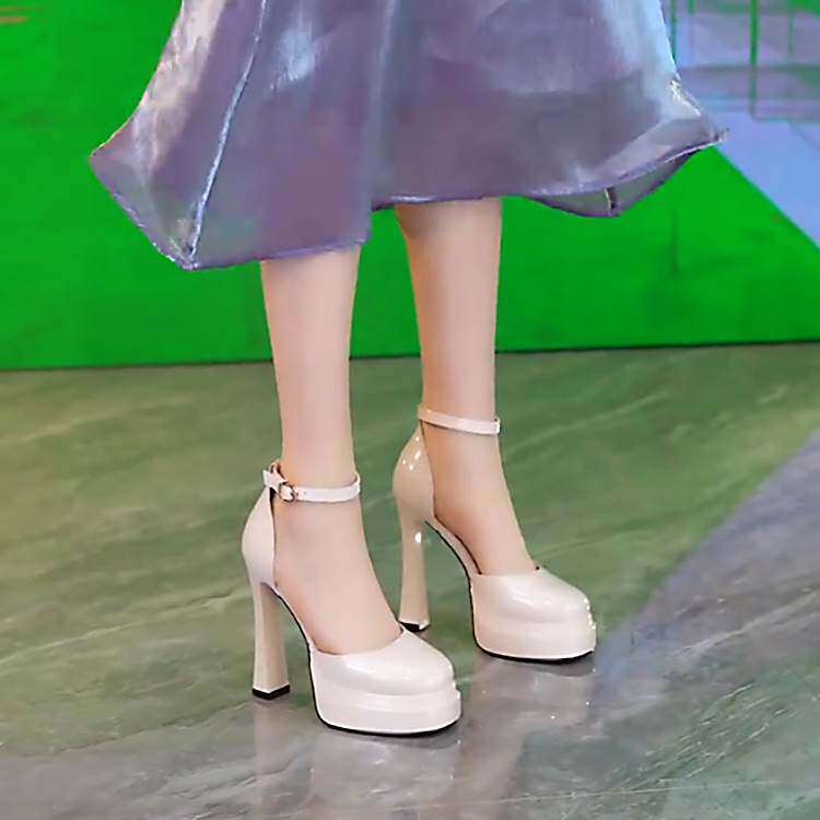 11cm一字扣带超高跟鞋女春夏新款粗跟防水台漆皮中空气质百搭单鞋 - 1991美丽鞋坊