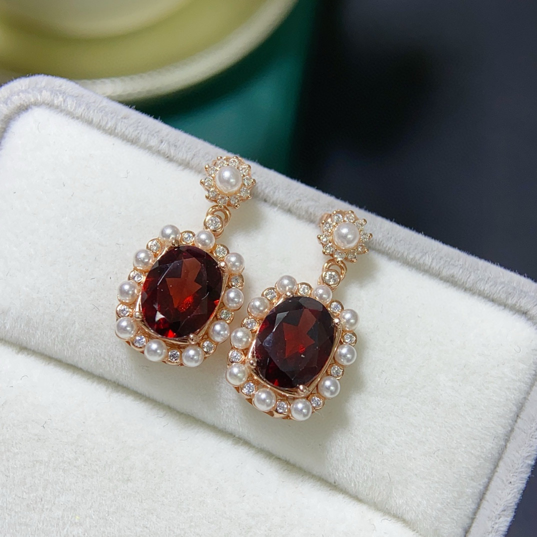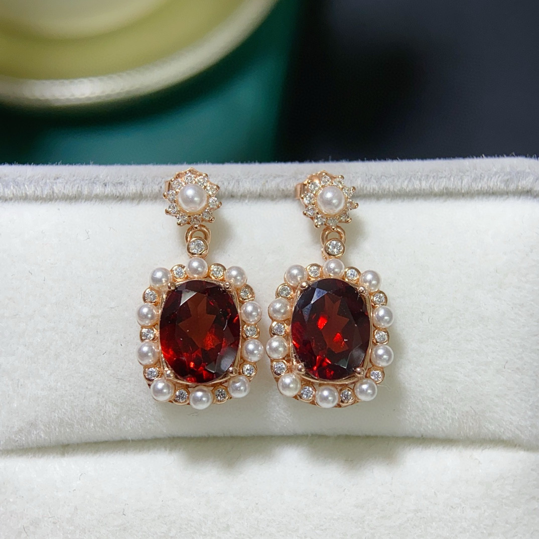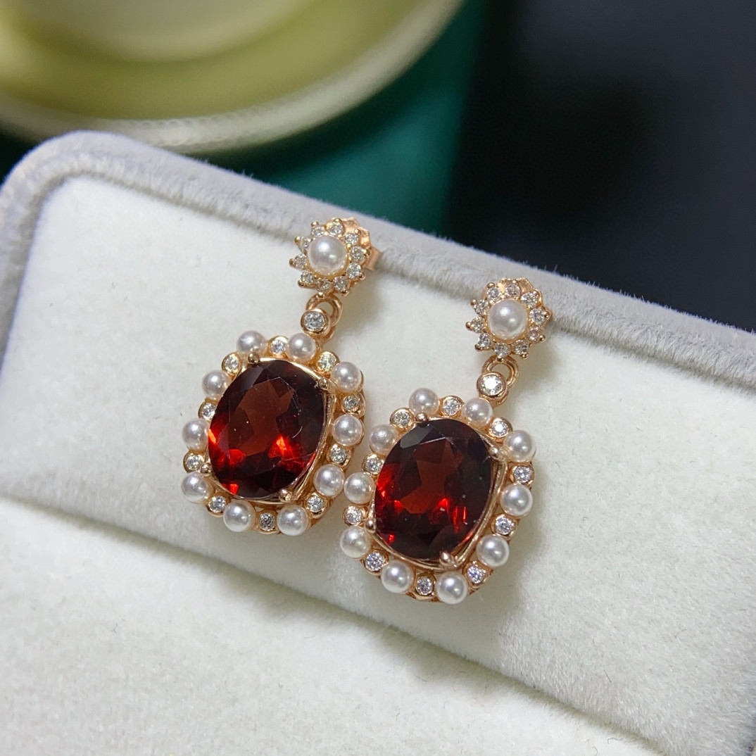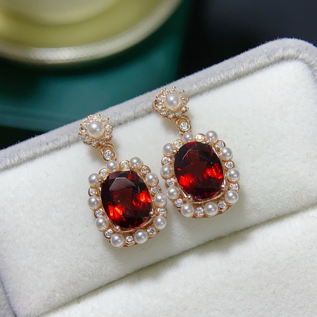 天然莫桑比克石榴石耳钉套装女人石女s925纯银珍珠玫瑰金色 - 艾缘彩宝成品批发企业店
