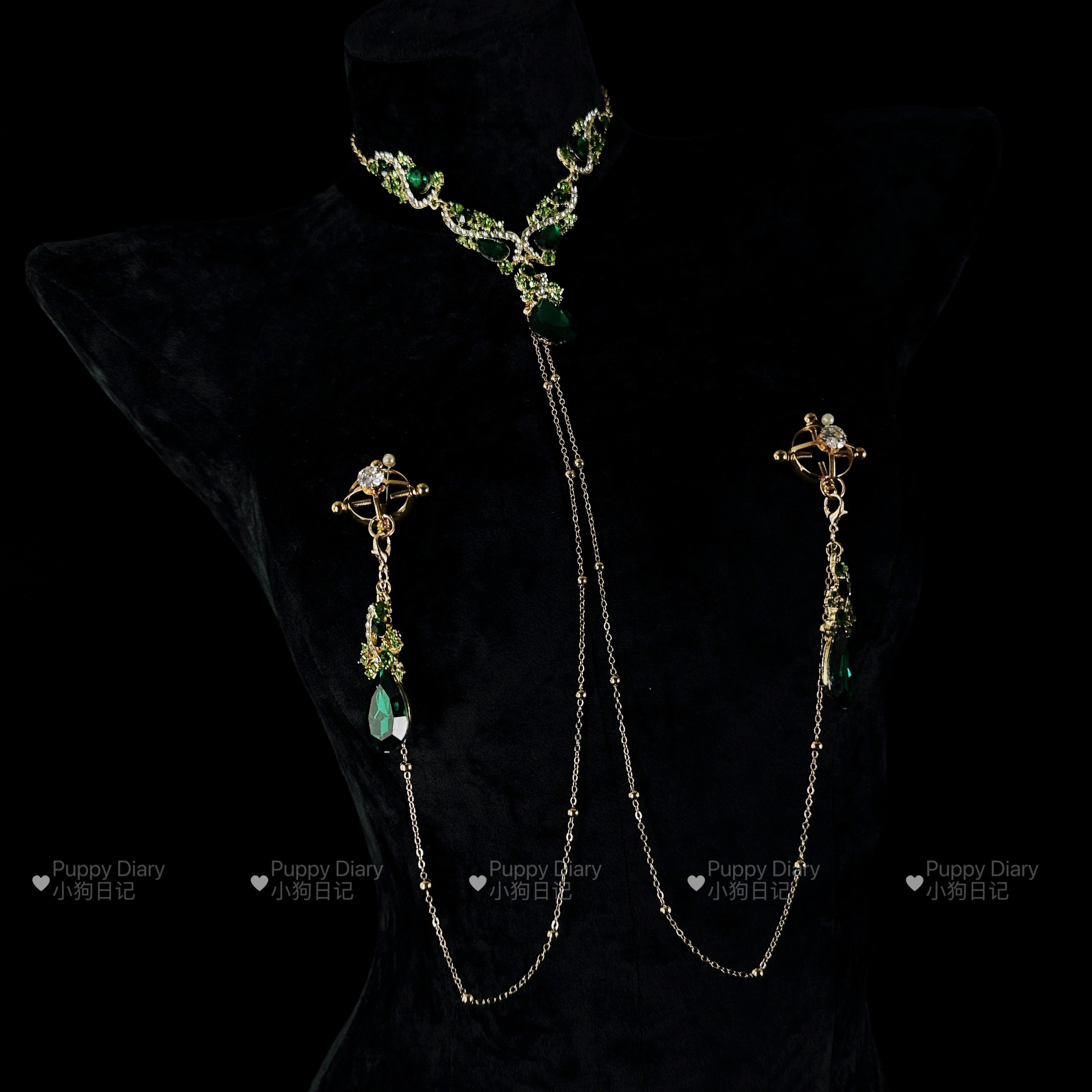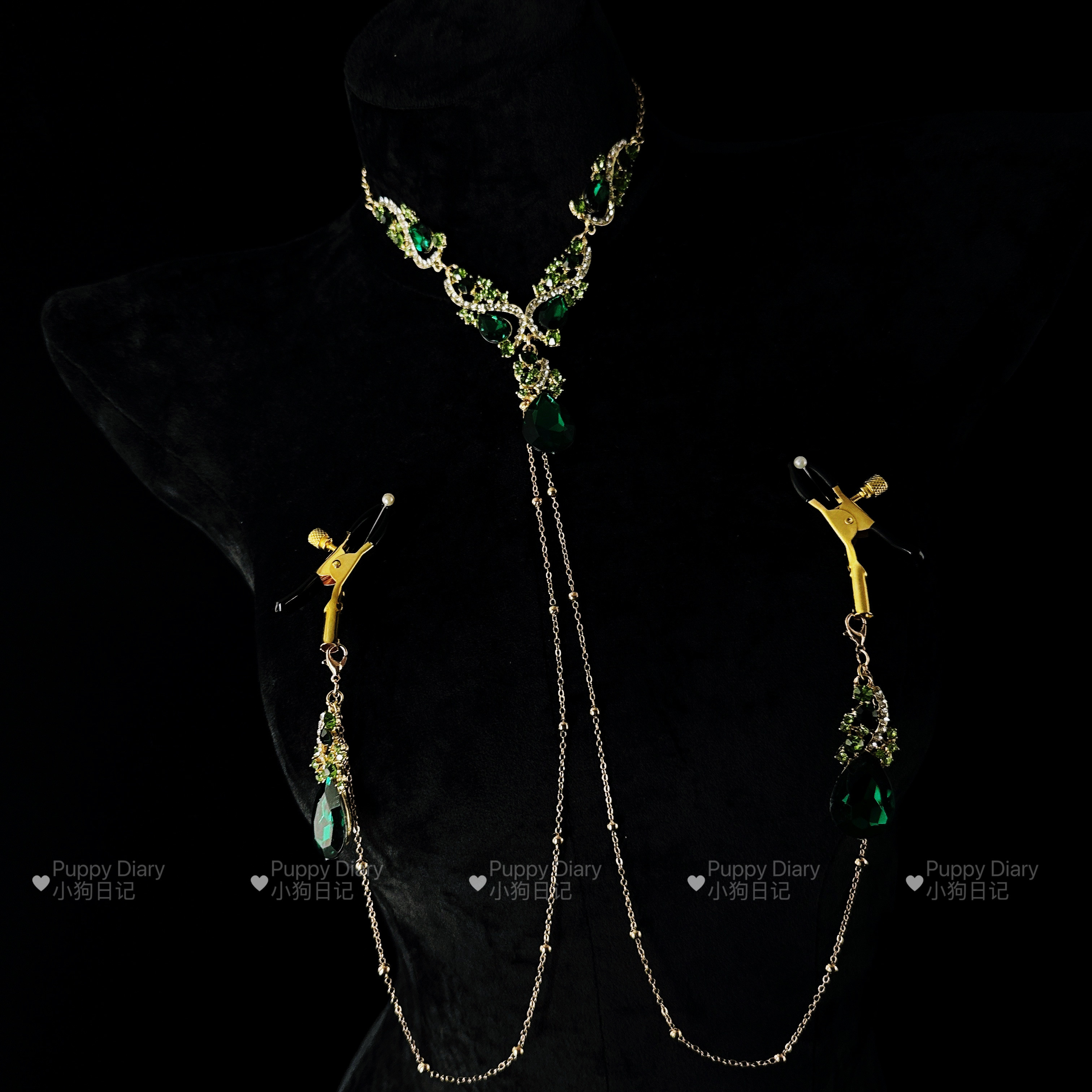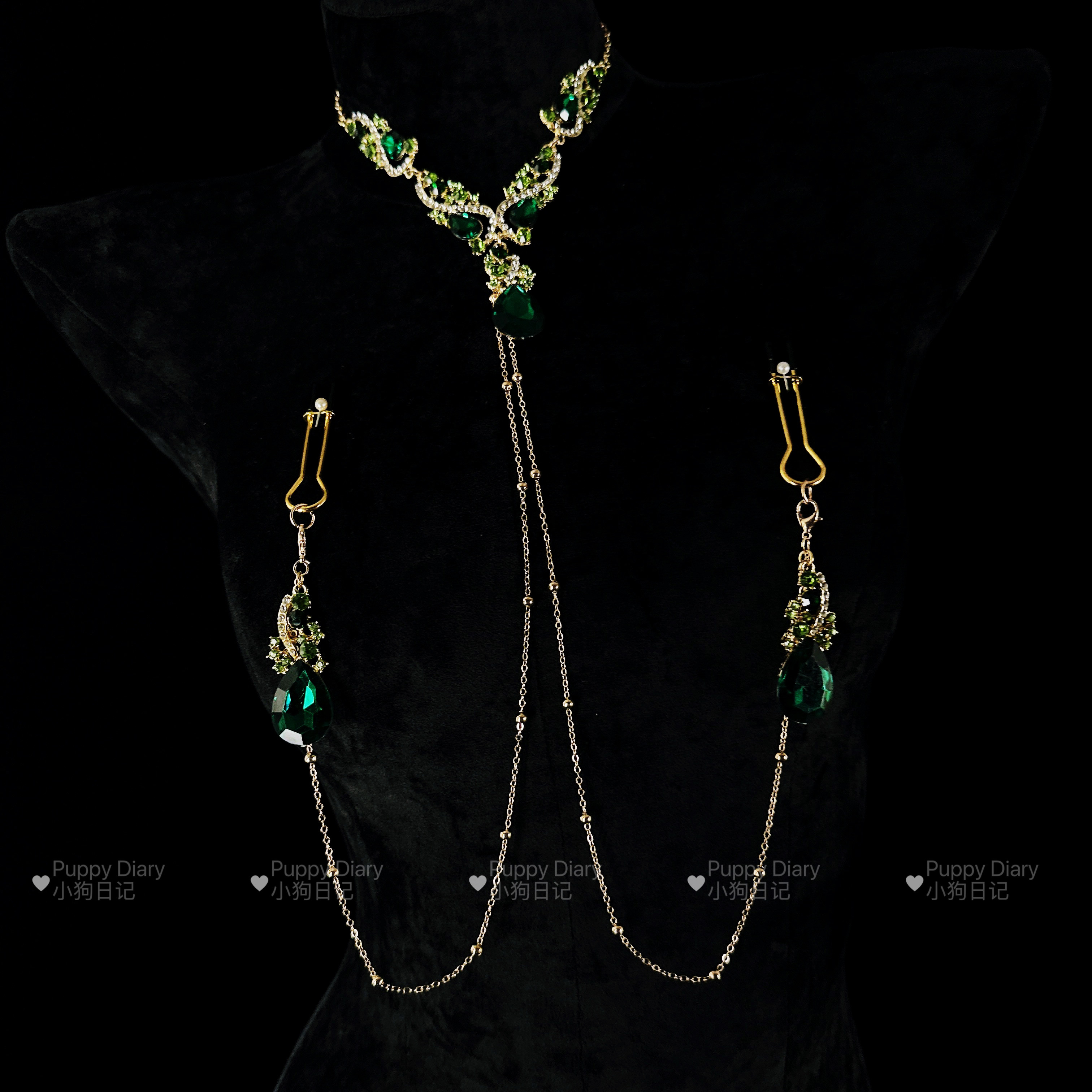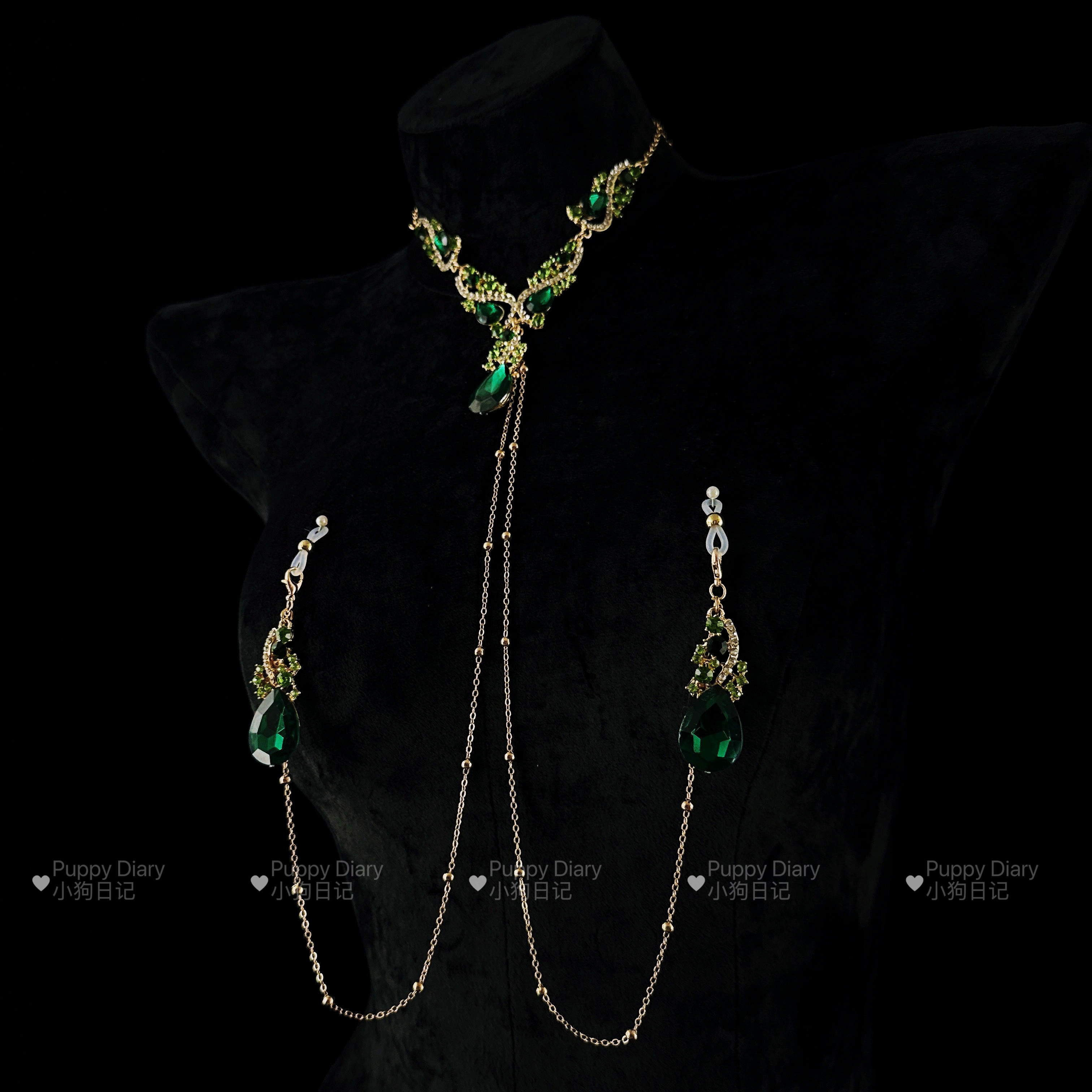 Puppy*绿水晶choker项链胸链身体链女复古夸张设计感满钻锁骨链 - Puppy Diary小狗日记