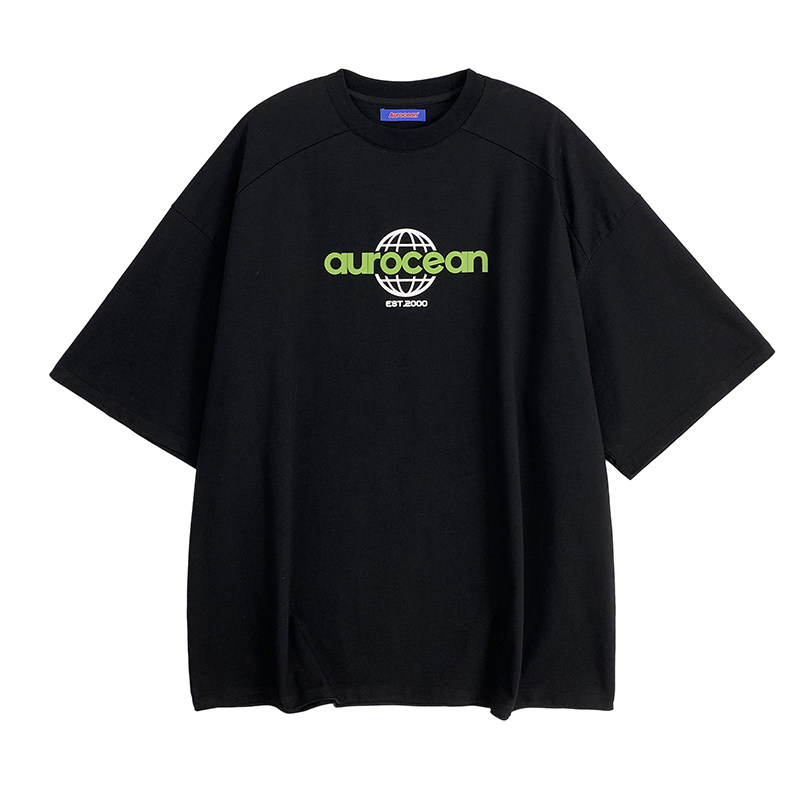 Aurocean 黑色T恤 320克重磅全棉复古机能短袖宽松少年感五分袖 - Aurocean