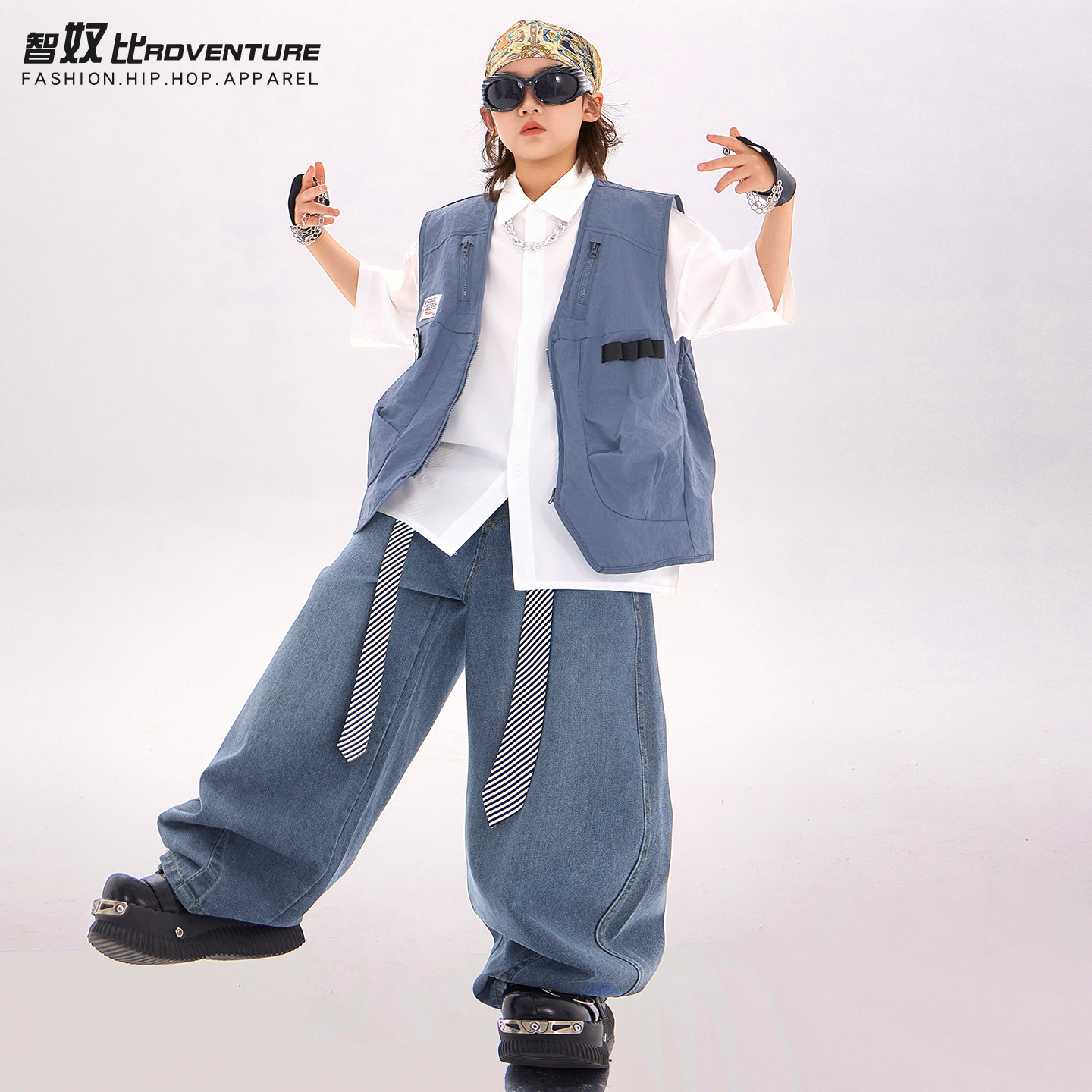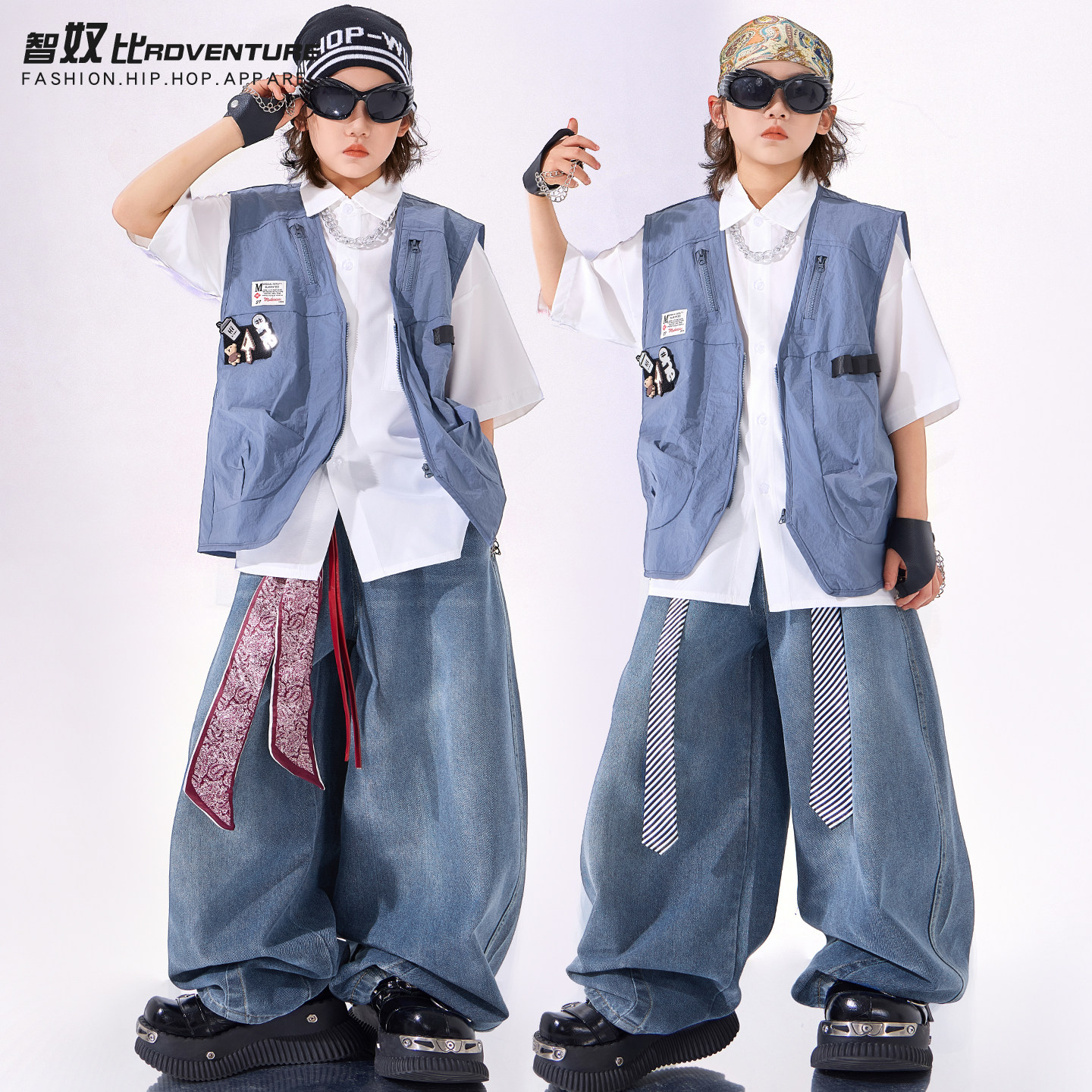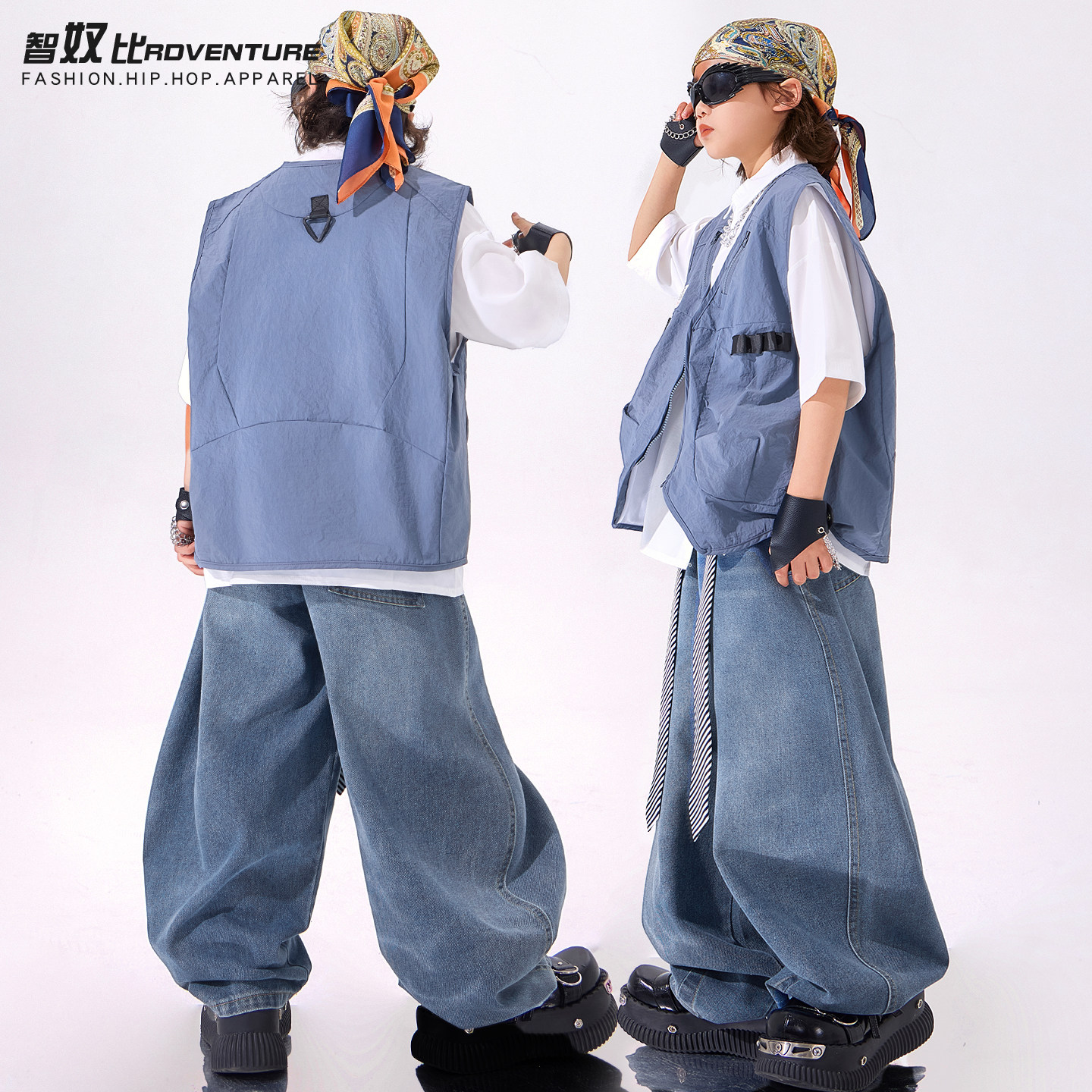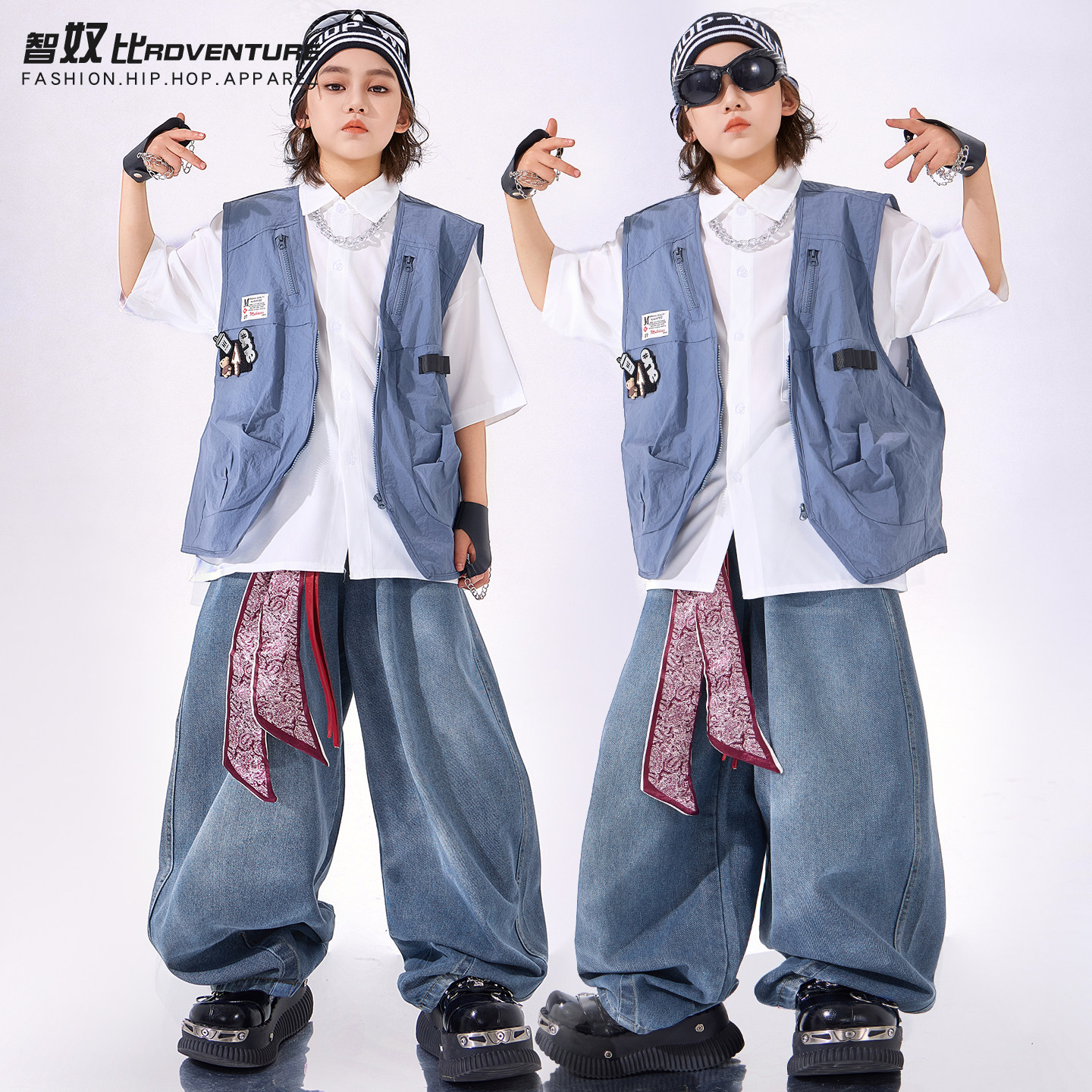 儿童街舞潮服男童嘻哈蓝色马甲三件套舞蹈服套装hiphop女童演出服 - 智奴比旗舰店