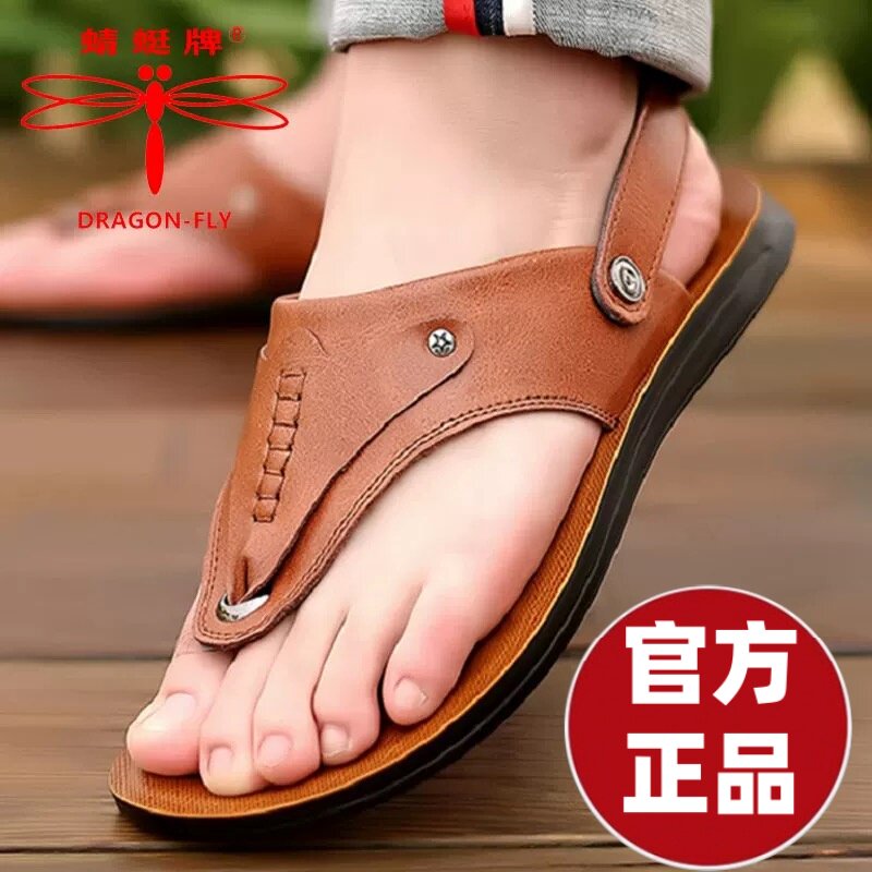 蜻蜓牌男凉鞋夏季新款软底沙滩鞋防滑两用真皮夹脚人字拖鞋驾车鞋 - 蜻蜓牌真皮直销店