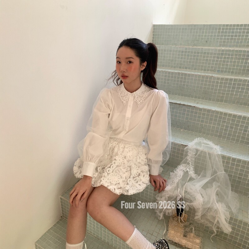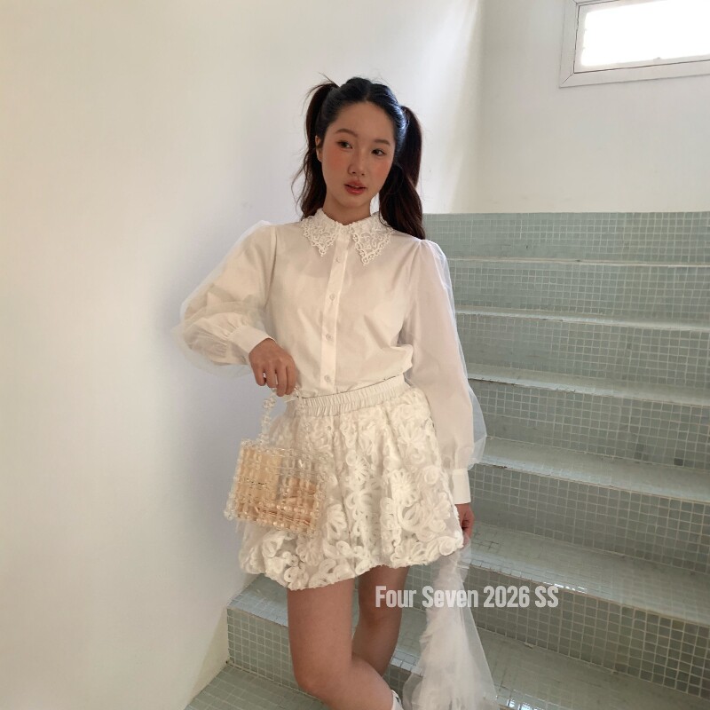 FOUR SEVEN 2026SS 韩系chic百搭显瘦蕾丝花边领网纱灯笼袖衬衫 - 艾米薇琪女装