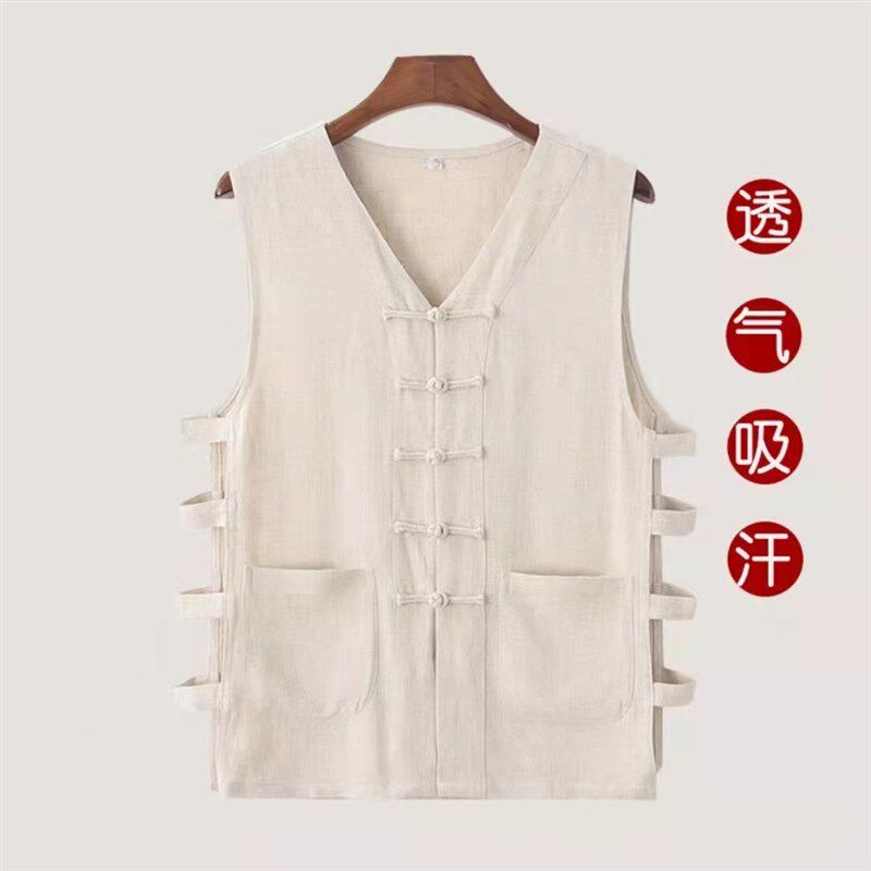 【只此青绿】唐装麻类复古风马甲男夏天薄款透气宽松无领汗衫背心 - 弘顺优选精品店的小店