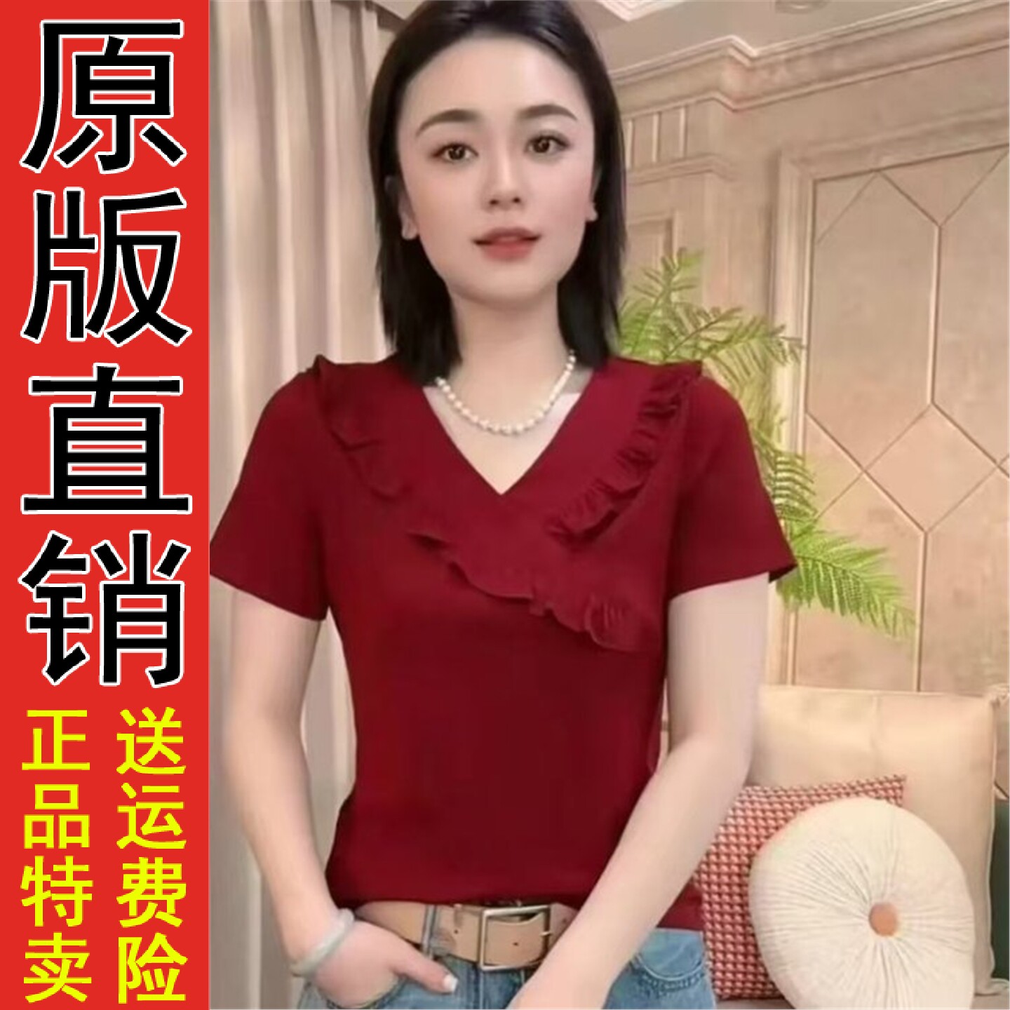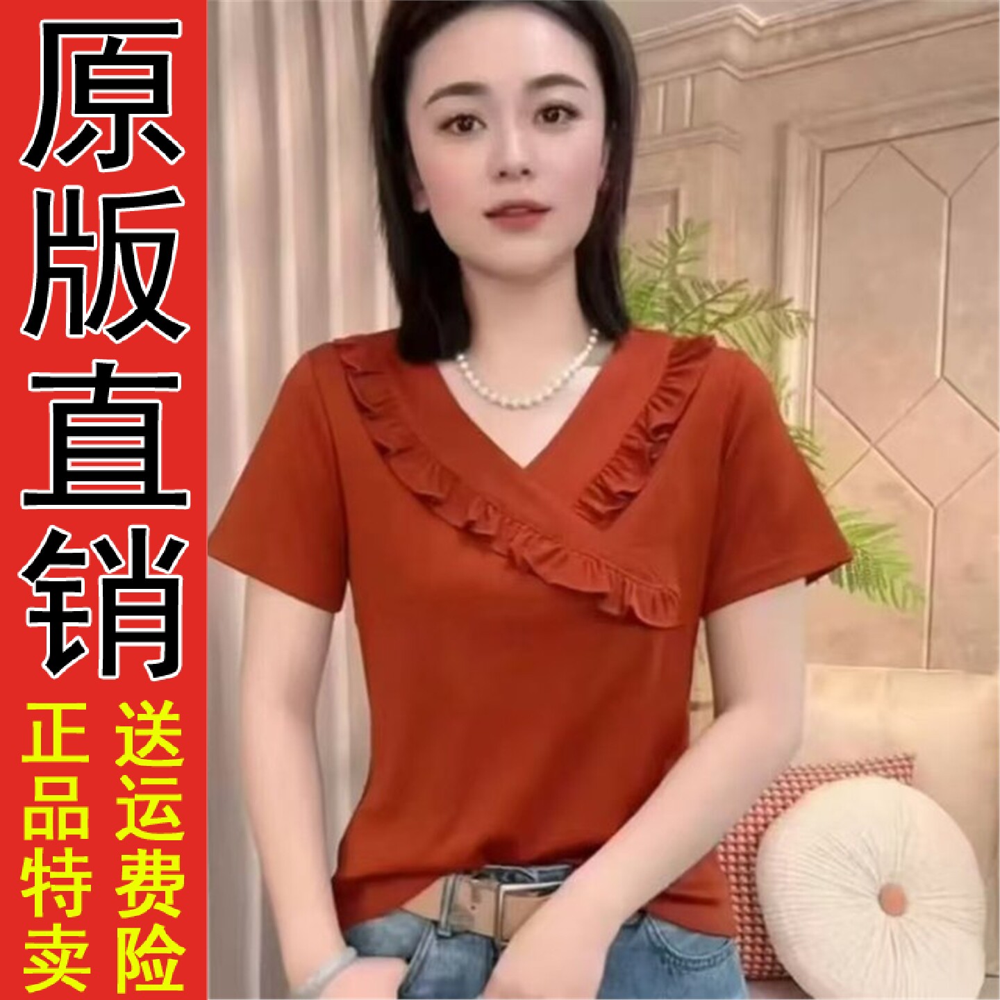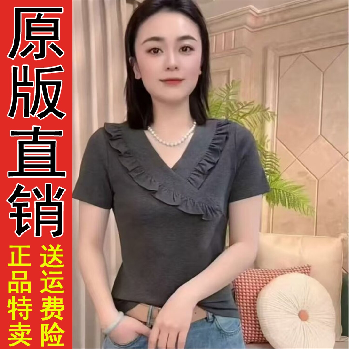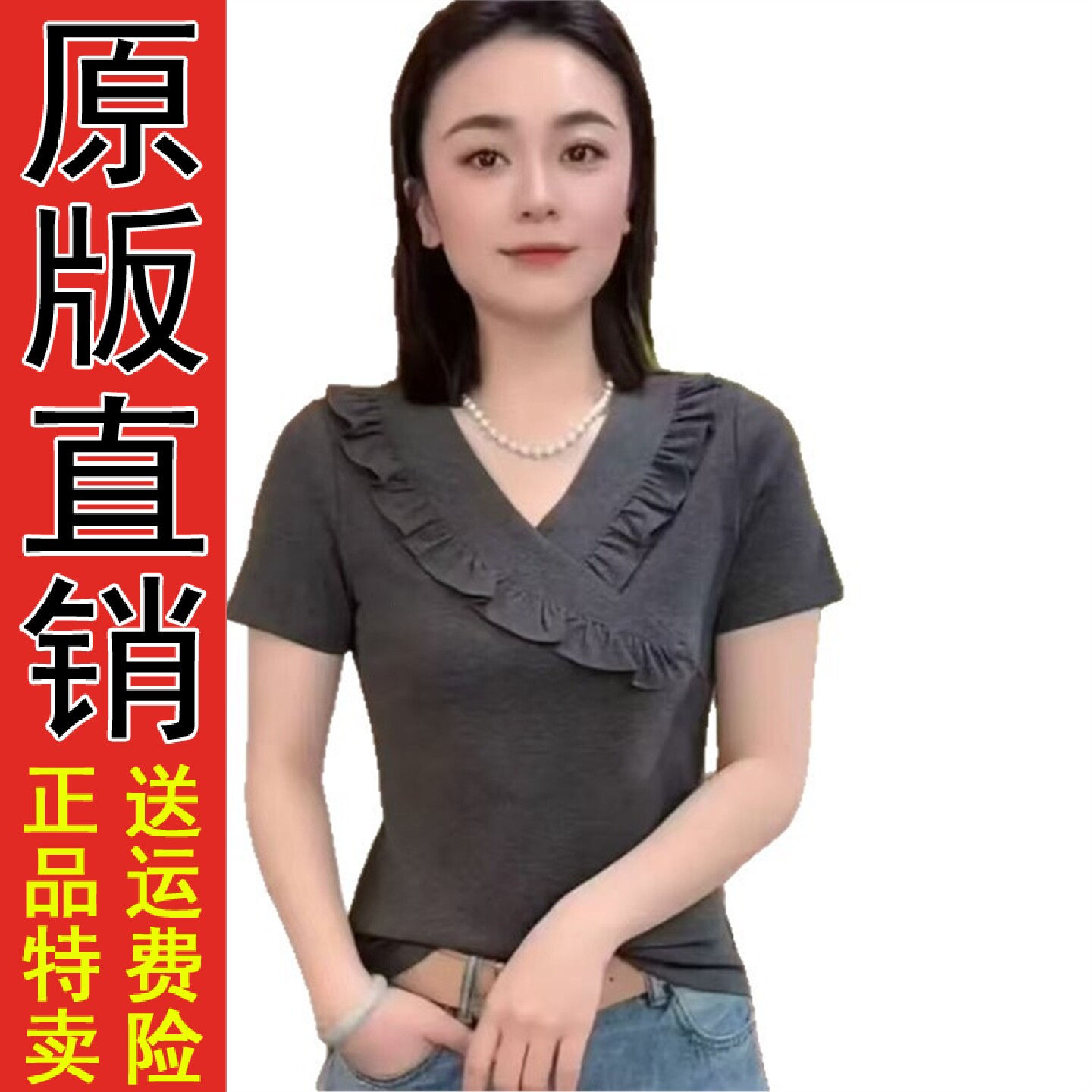 好品灰色荷叶边V领短袖T恤女2026新款夏季大码胖mm显瘦正肩高级感 - ROSE玫瑰