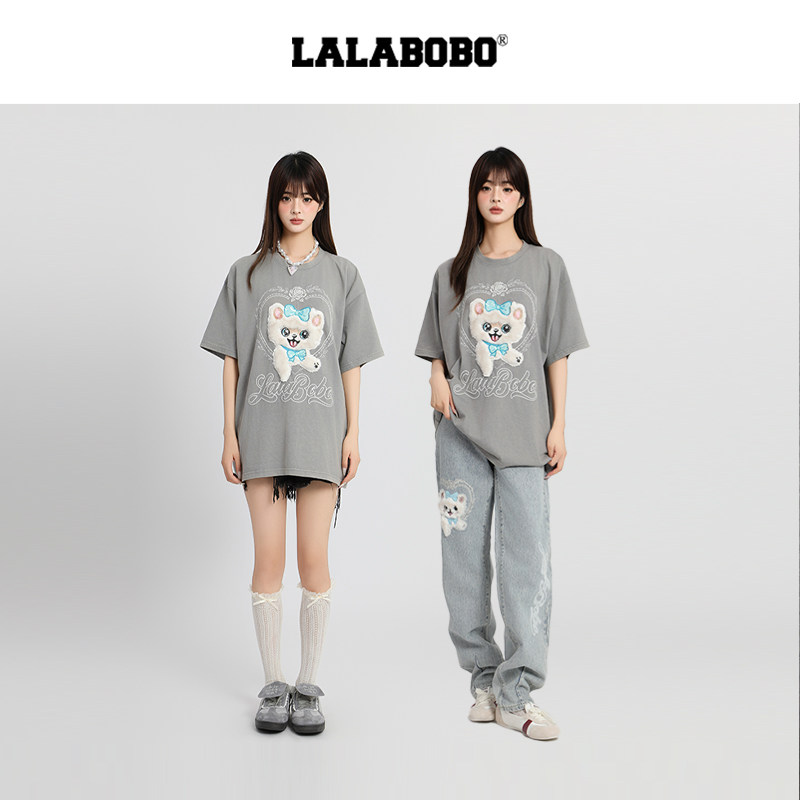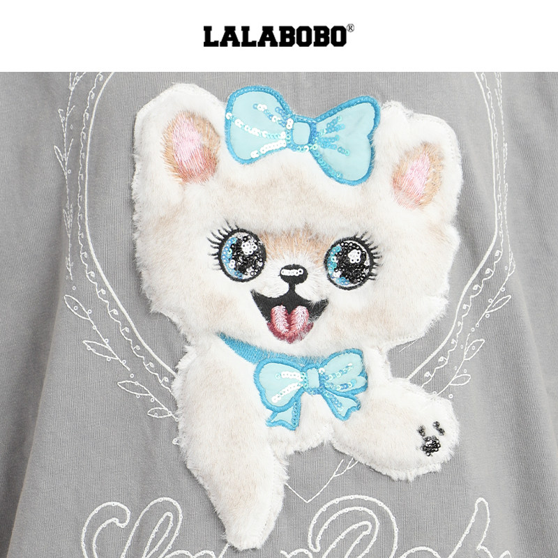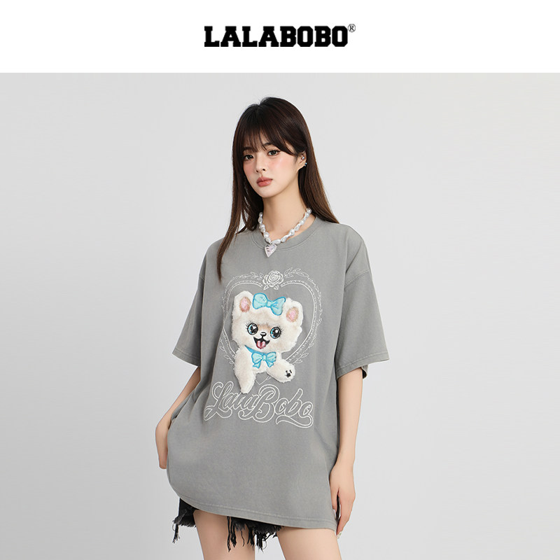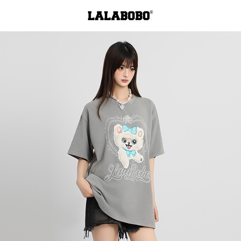 【商场同款】LALABOBO25年夏新款短袖上衣女毛绒小猫灰色宽松T恤 - lalabobo官方特卖店