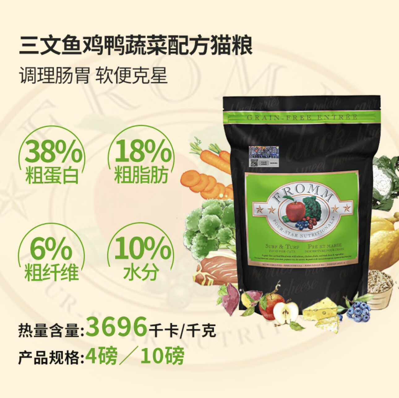 您的位置:安康生态农业开发平台  >   >  晟煜标Fromm福摩无谷三文鱼鸡鸭蔬菜全阶猫粮10LB软便克星绿福摩