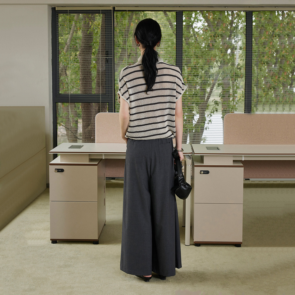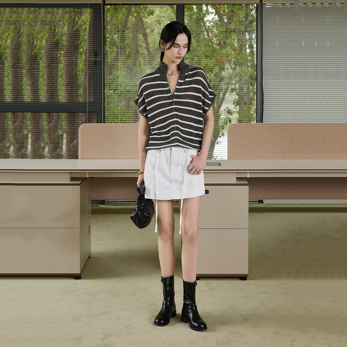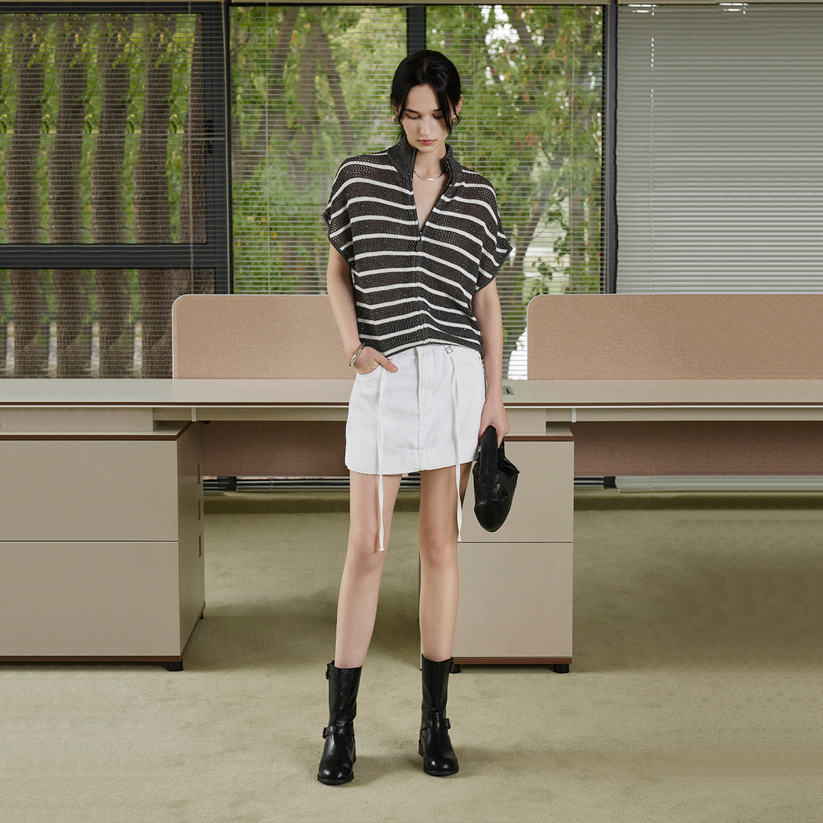 CLMX丝麻混纺纱干爽透气骨感有型 镂空条纹复古立领针织短袖上衣 - CLMX服饰旗舰店