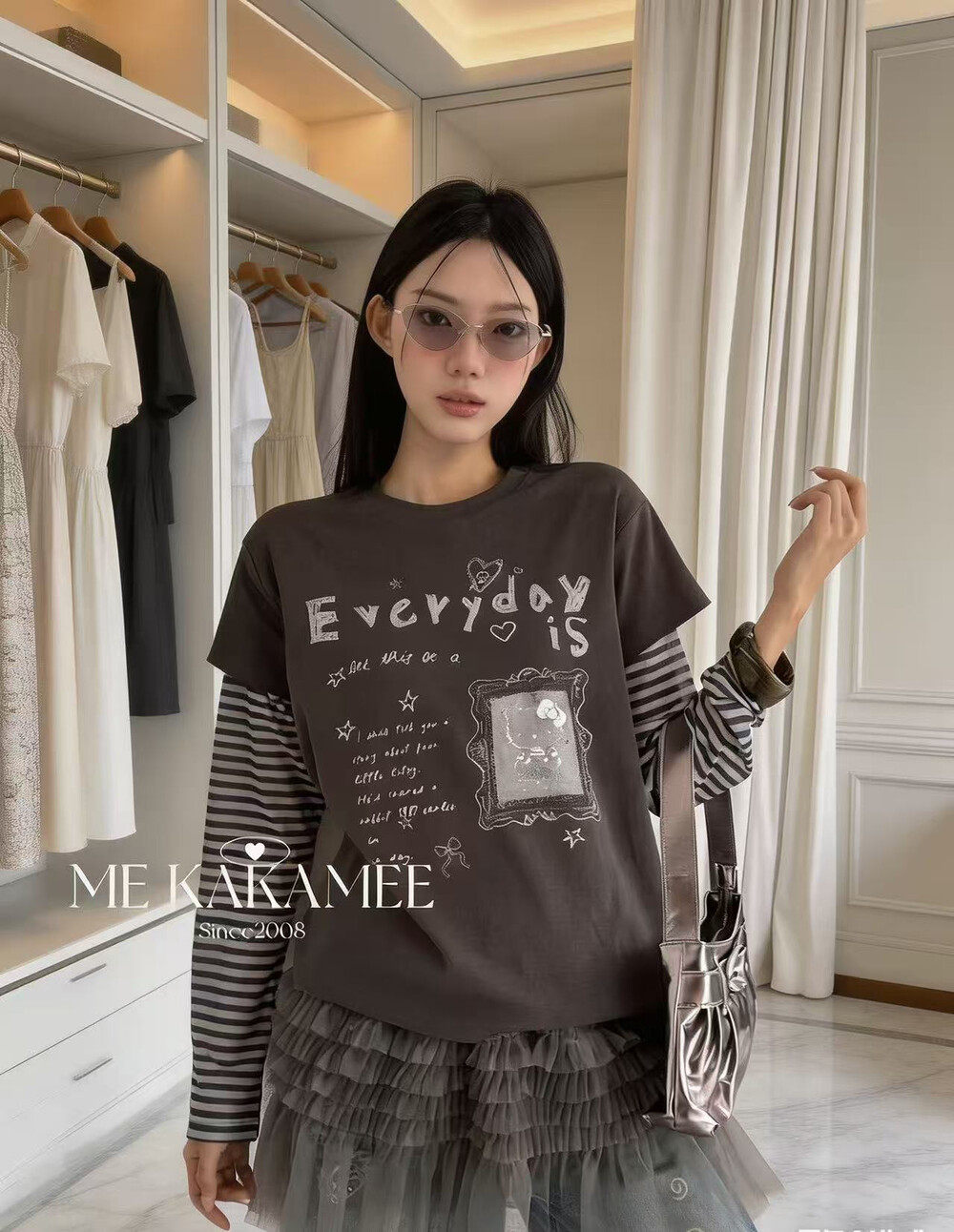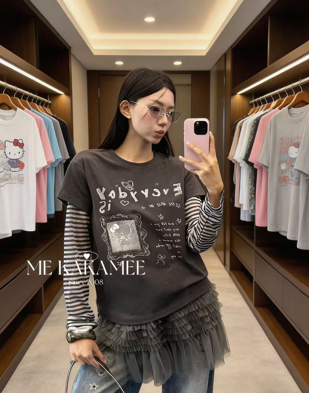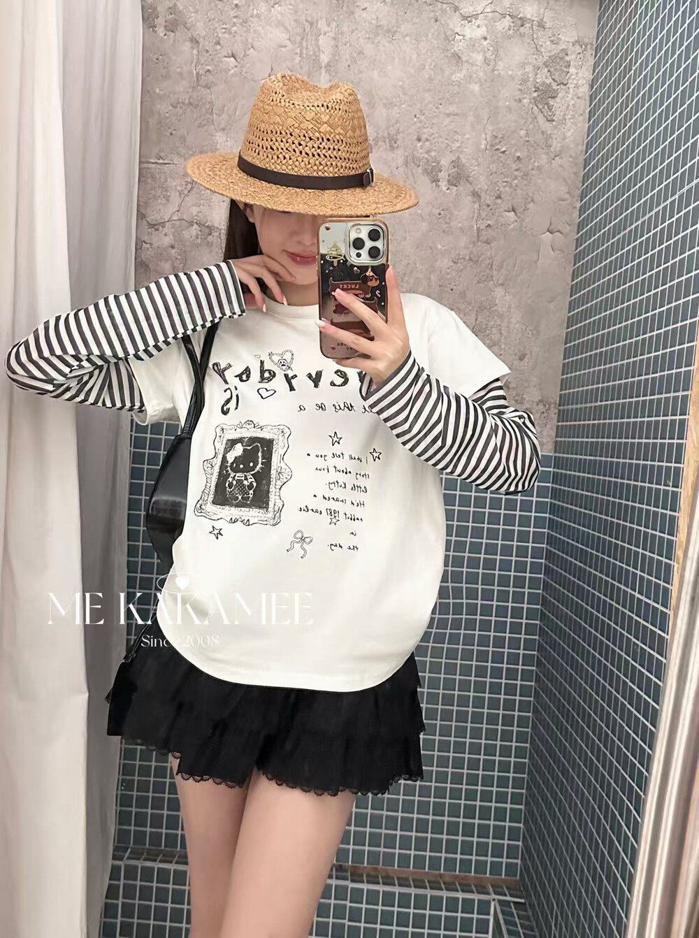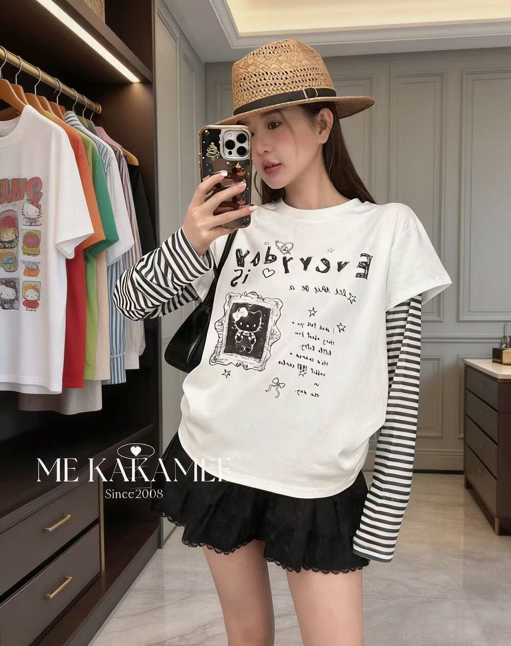 ME KAKAMEE新品拼接假两件设计字母KT猫长袖T恤上衣女9157 - LE studios