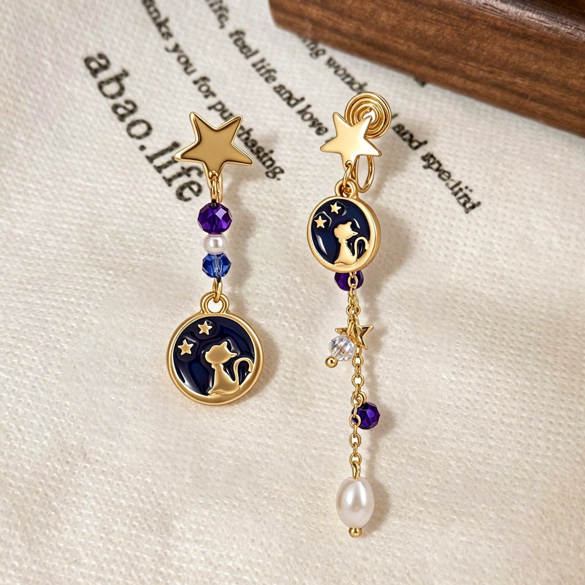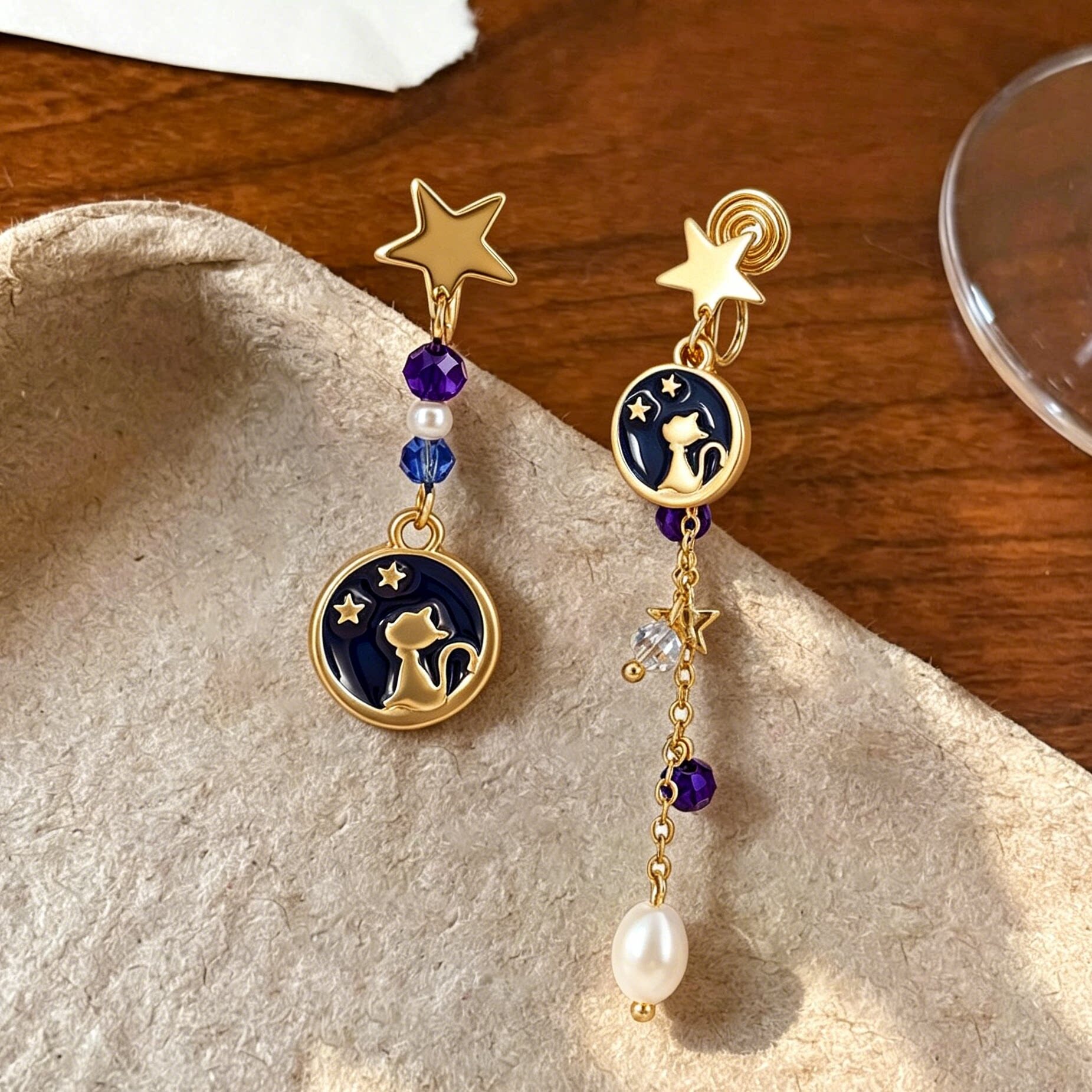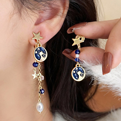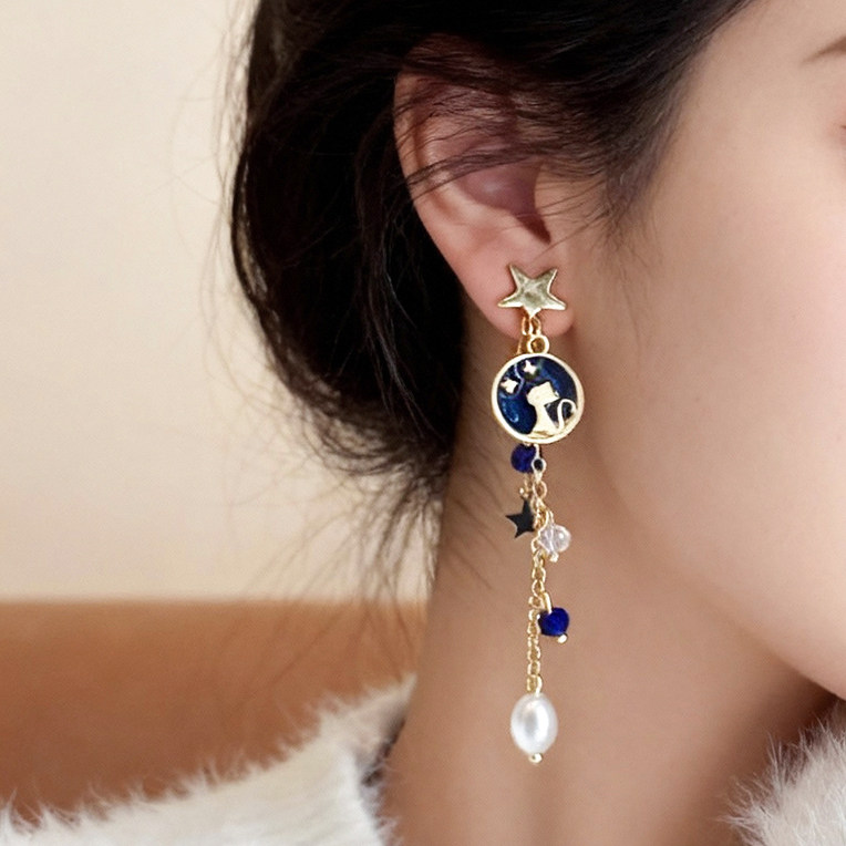 wind夏夜星空猫咪不对称流苏无耳洞耳夹女创意高级设计感小众耳饰 - Wind 等风来