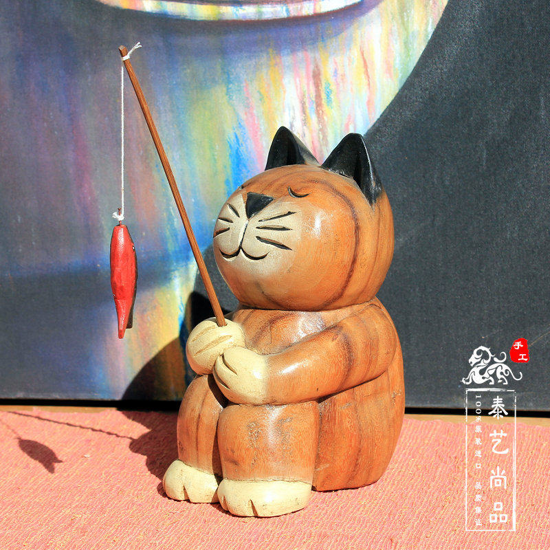 泰国进口实木创意东南亚风格小猫钓鱼木雕家居客厅花架小猫咪摆件 - 湖海摄影社