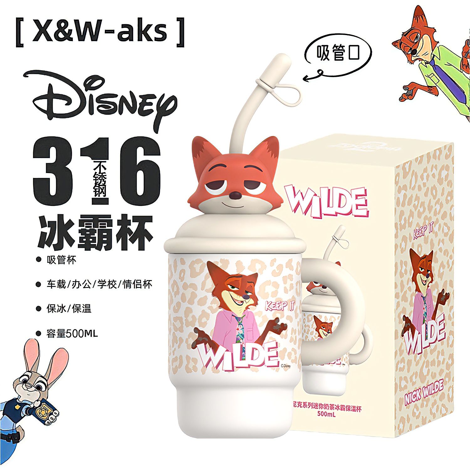 【疯狂动物城】尼克朱迪冰霸保温杯650ml不锈钢车载办公吸管水杯 - 艾可思餐饮具用品