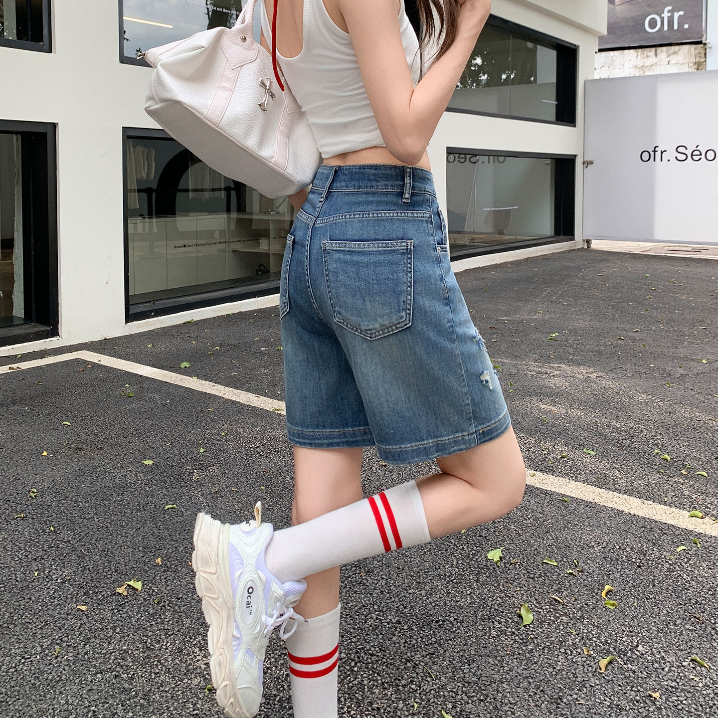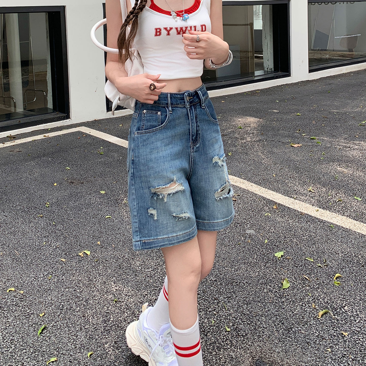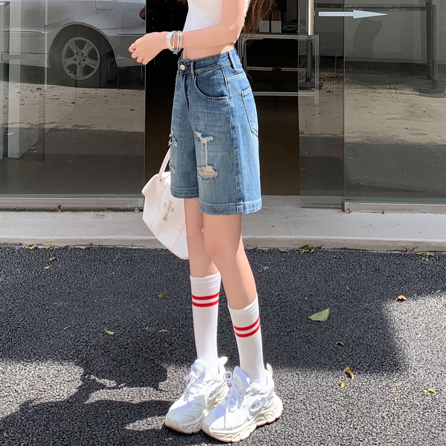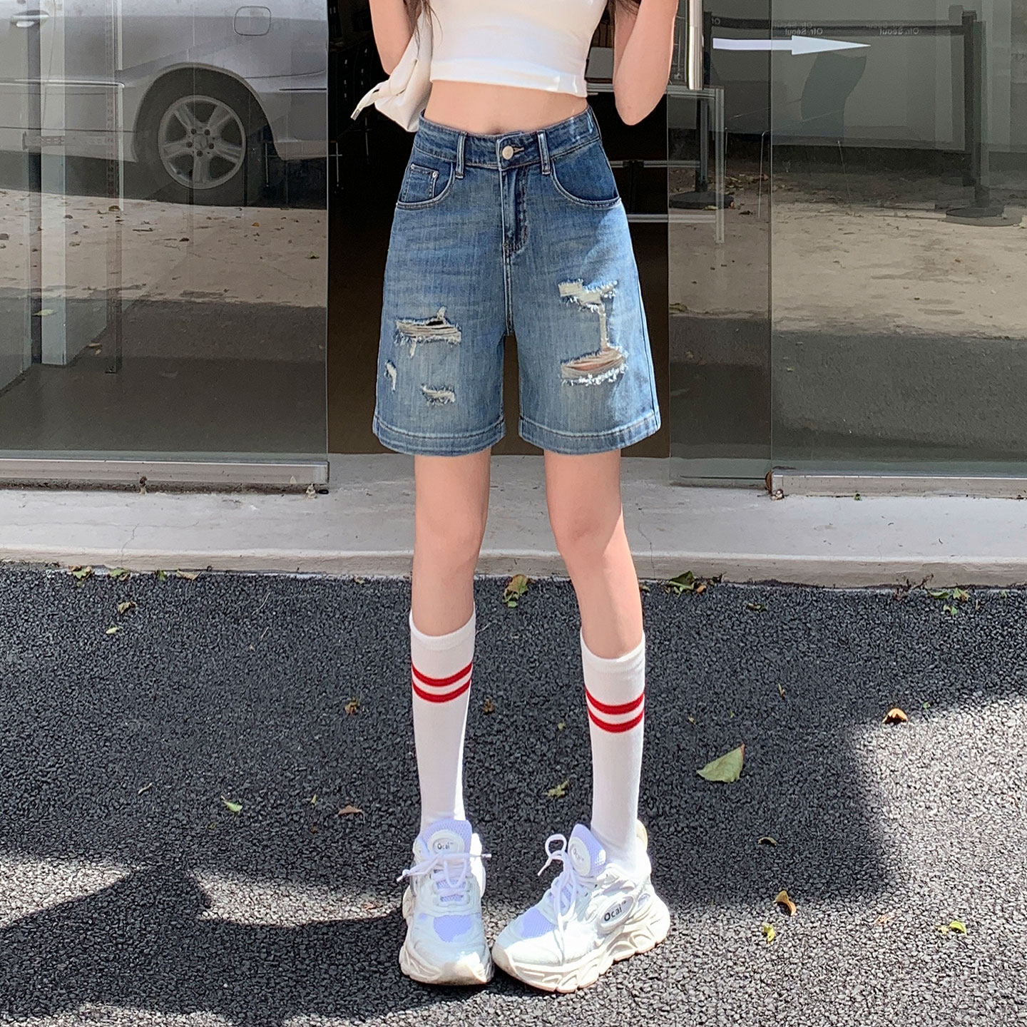 美式夏薄款高腰弹力宽松直筒复古破洞牛仔短裤女中裤小个子五分裤 - 羊城服装 Canton costume