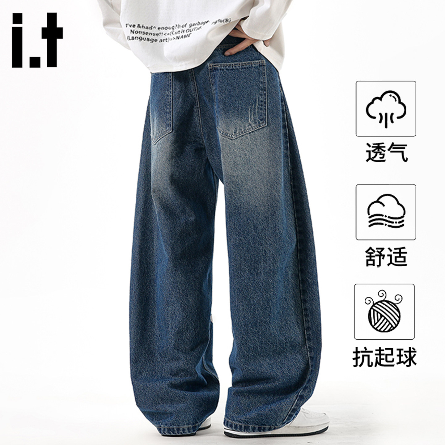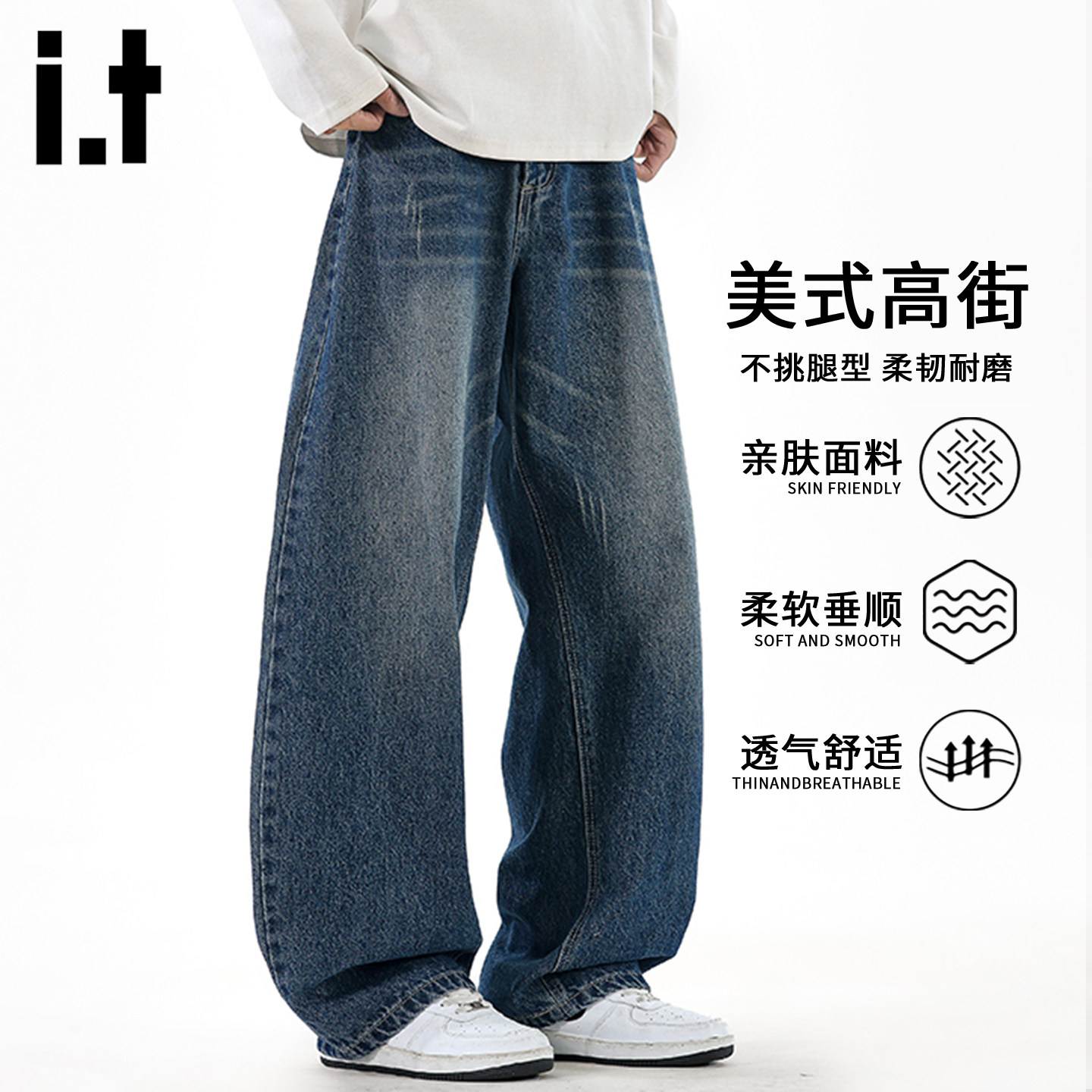 it FIVECM美式高街复古水洗牛仔裤男士夏季宽松透气直筒阔腿长裤 - FIVE CM官方旗舰店