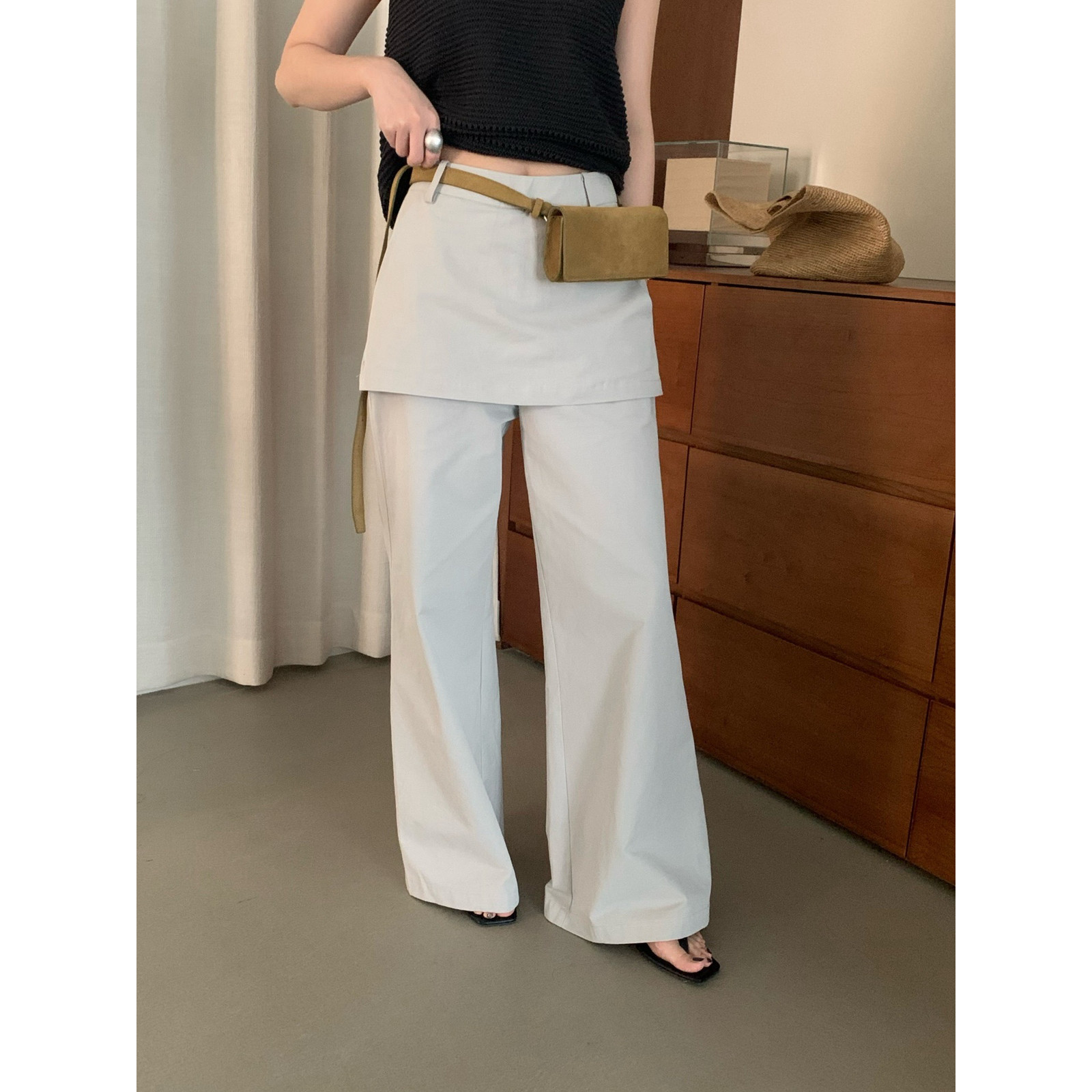 TE夏季韩版拼接屁帘净版假两件阔腿休闲裤女百搭高腰显瘦长裤子潮 - WH HOME