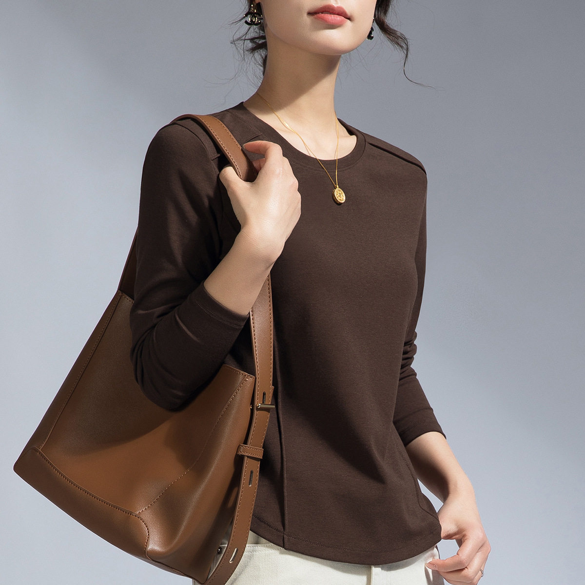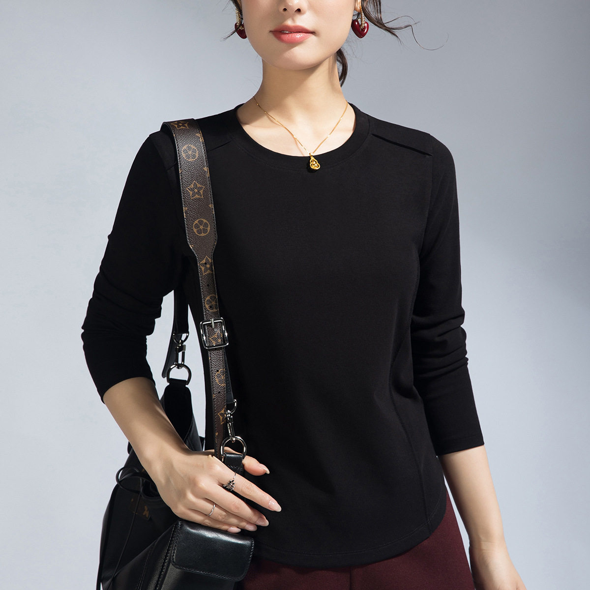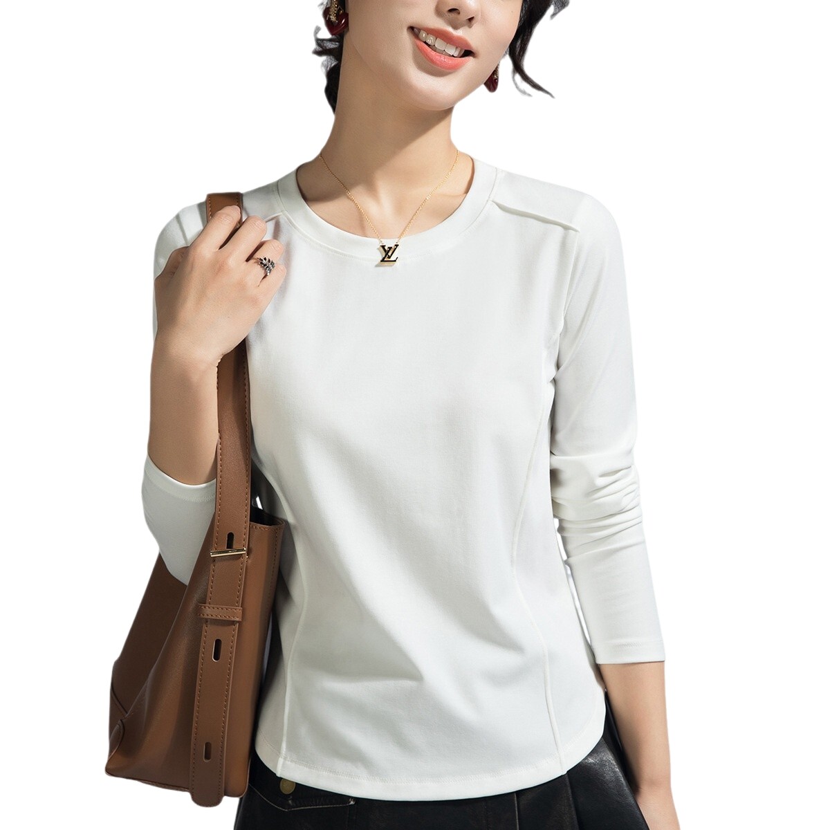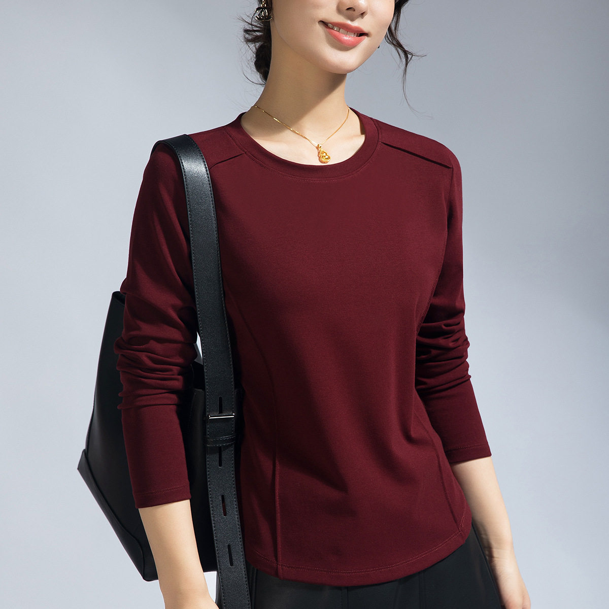 鱼骨线慕斯金品罗纹腈纶春季遮肚弧形下摆显廋大码圆领长袖t恤女 - 独爱家
