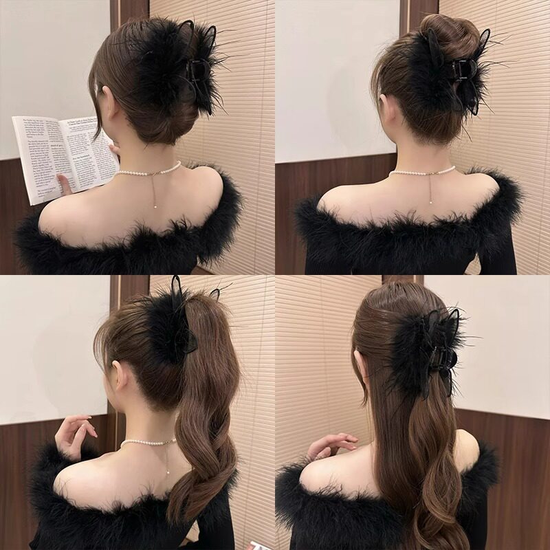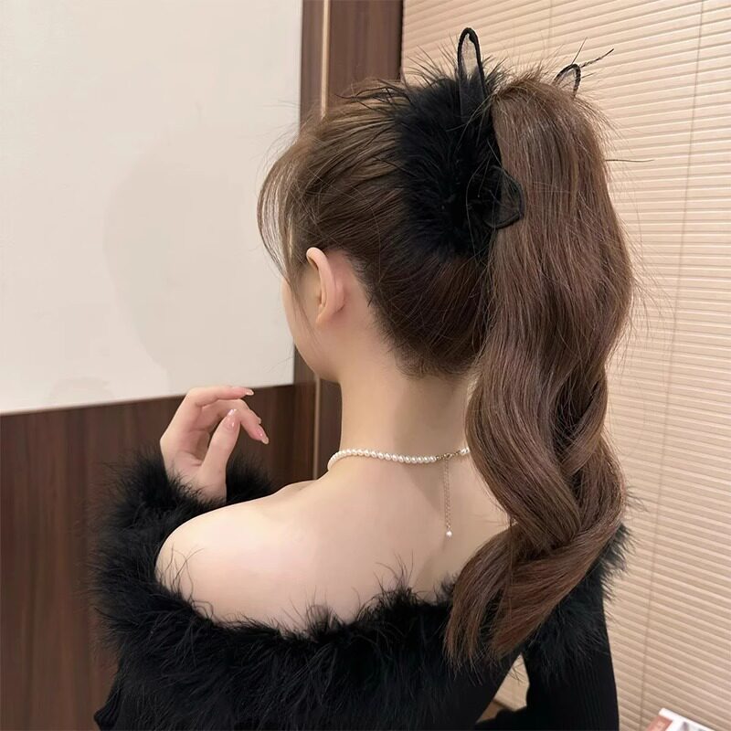 纯欲风黑色兔耳羽毛抓夹2025新款高端高级感后脑勺毛毛发夹女头饰 - 花间精灵