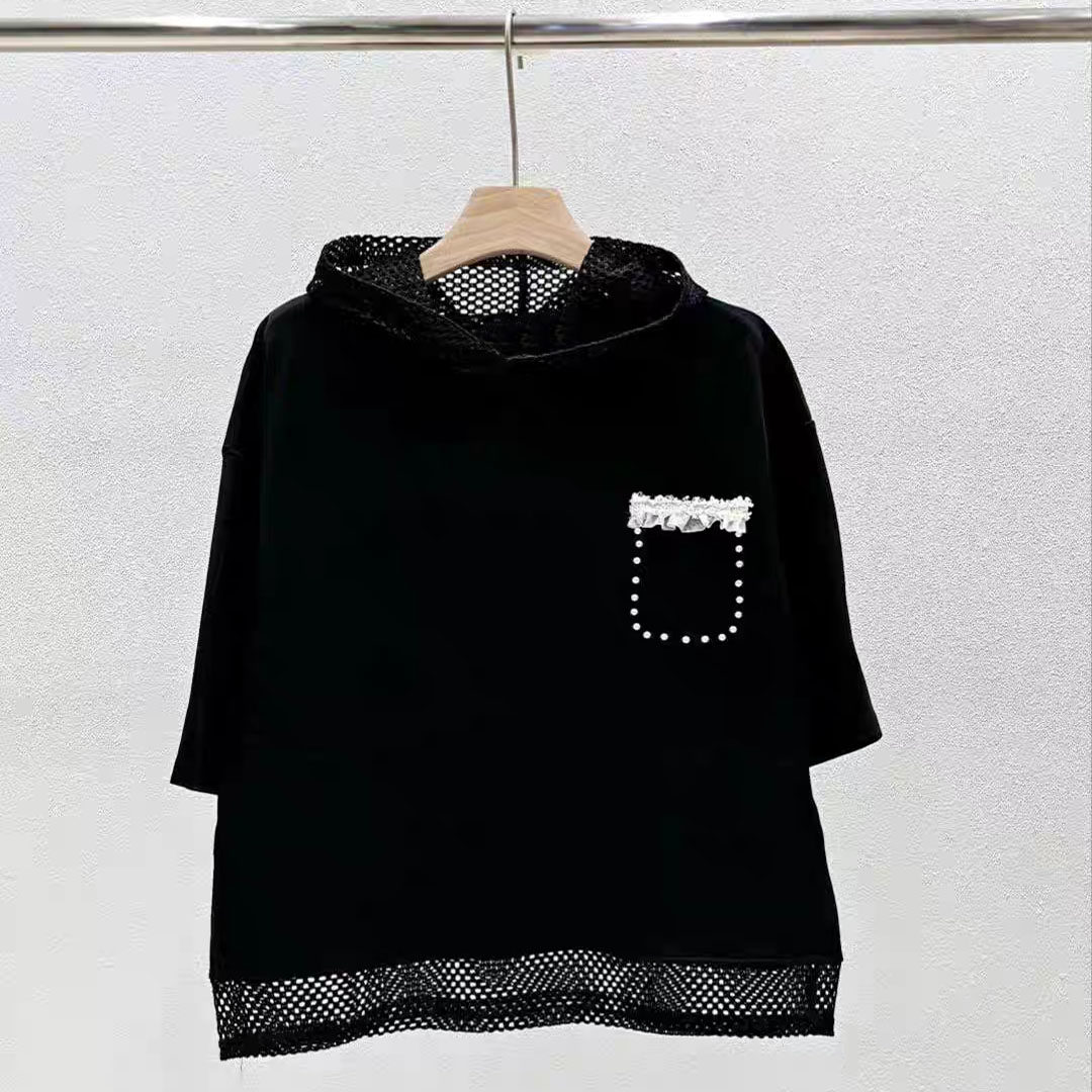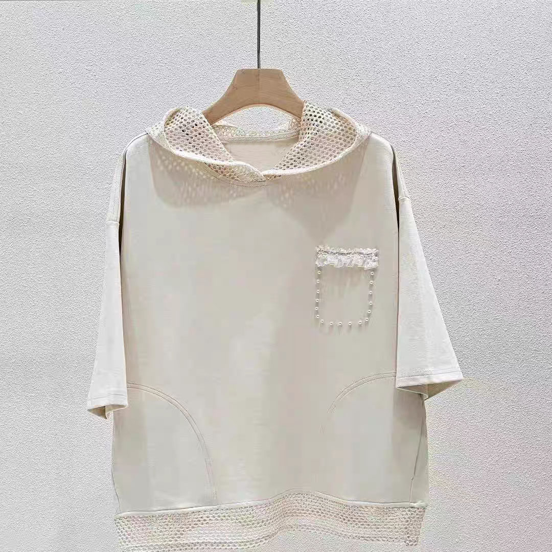 2026东大门春夏装新款女上衣镂空连帽钉珠拼接边宽松休闲短袖T恤 - ☆纽约外贸批发世界☆