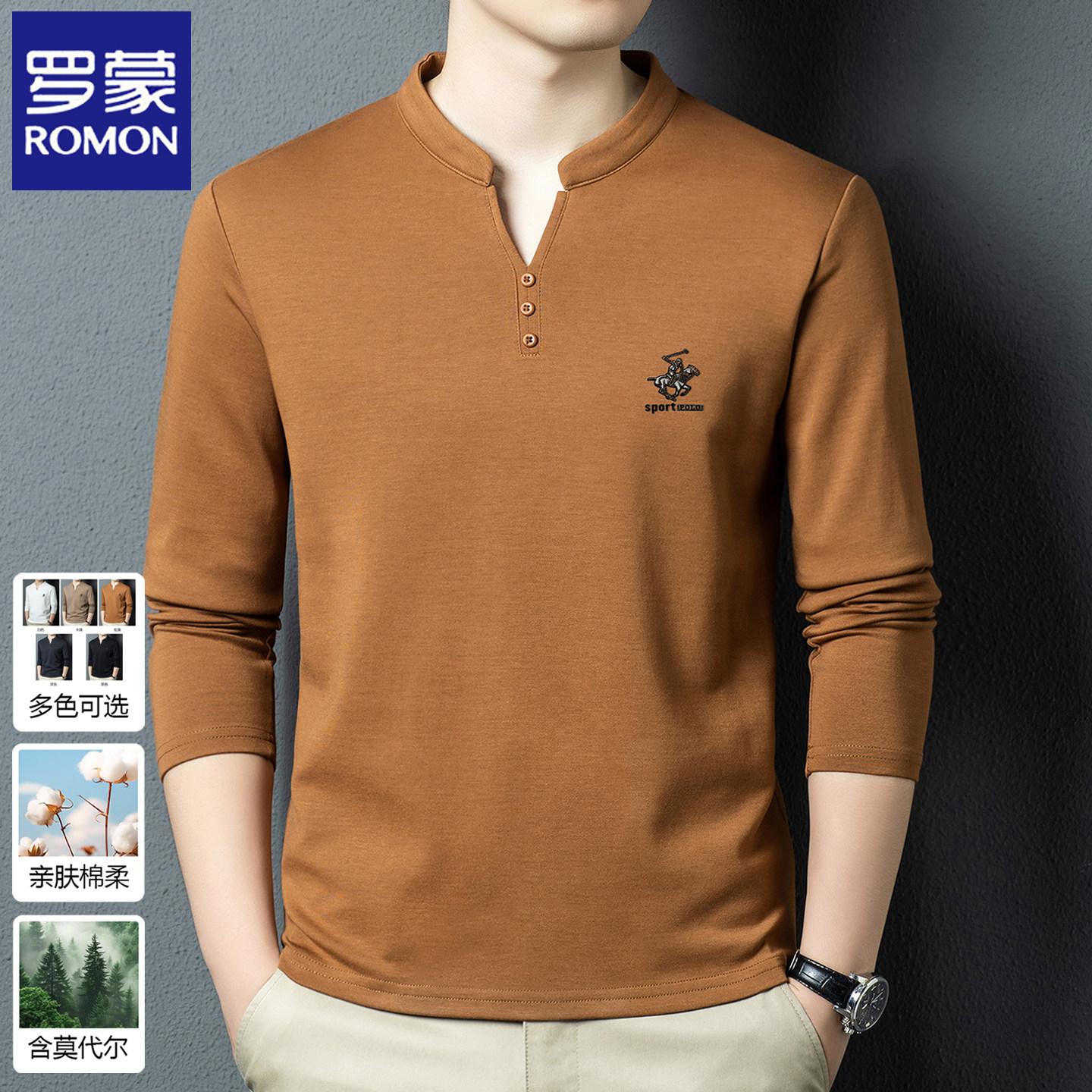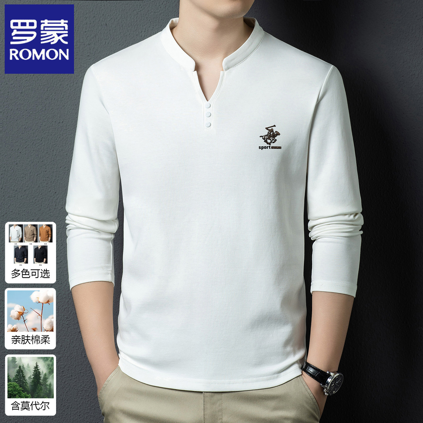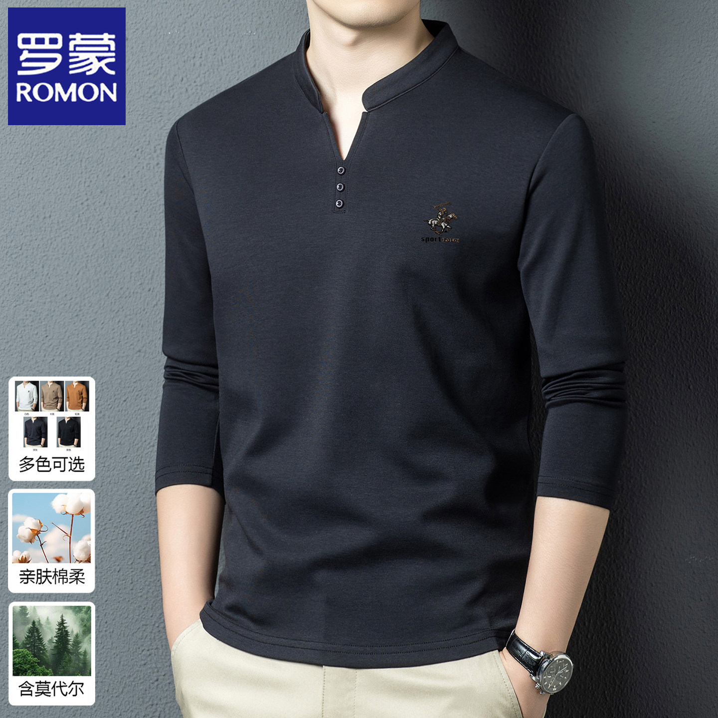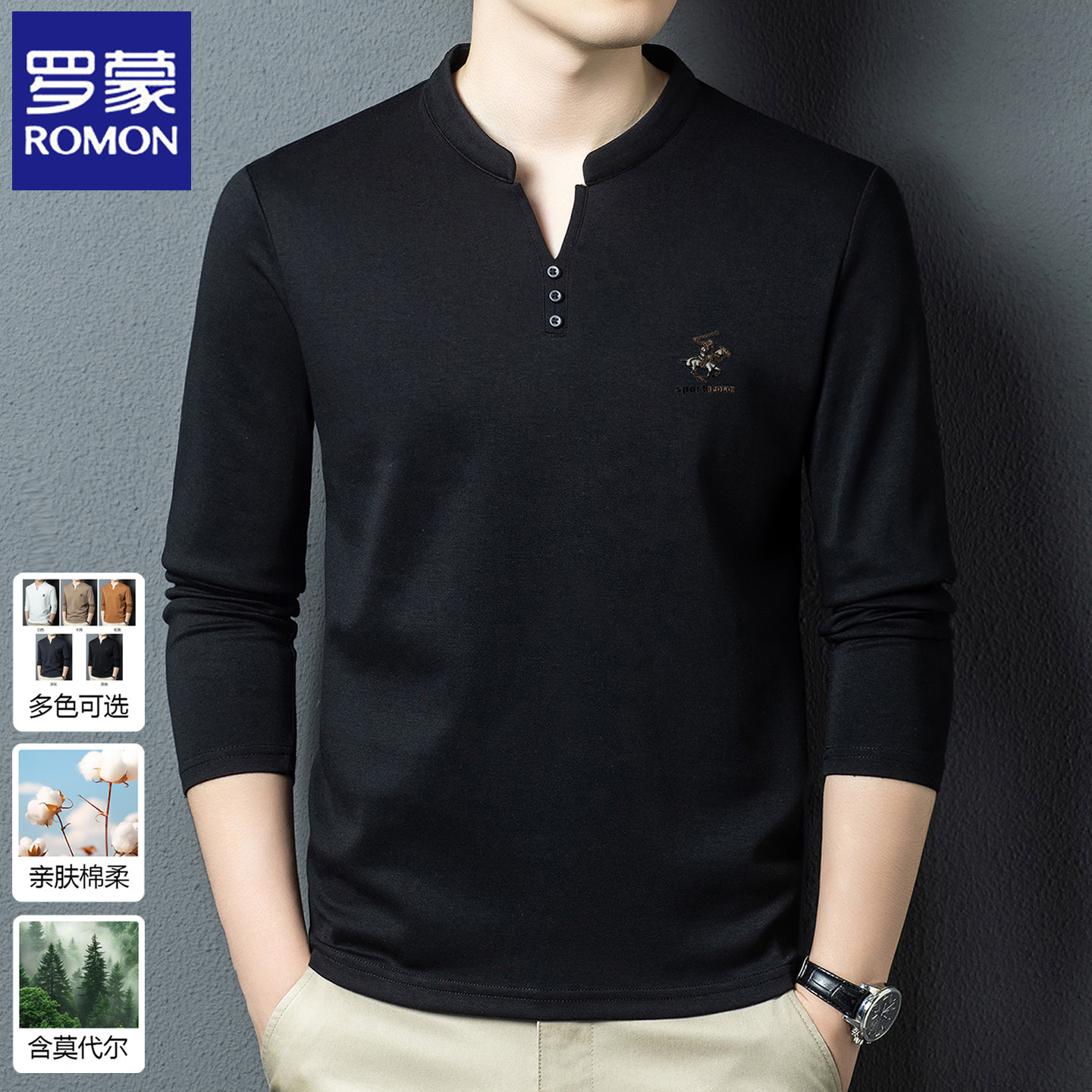 罗蒙2026春秋季新款男士长袖t恤男装卫衣中式国风V领打底衫上衣服 - 罗蒙高端男装精品店