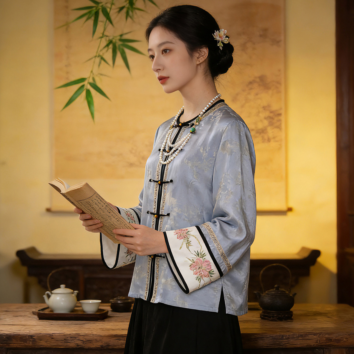 新中式通勤提花人丝刺绣上衣女春季立领衬衫长袖外套国风复古茶服 - 远镇新古典原创女装