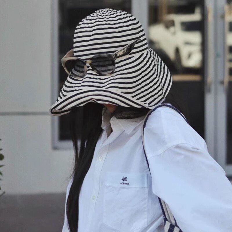 夏季黑白条纹大檐渔夫帽可折叠防晒遮阳帽海边度假显脸小透气帽子 - 友港优选