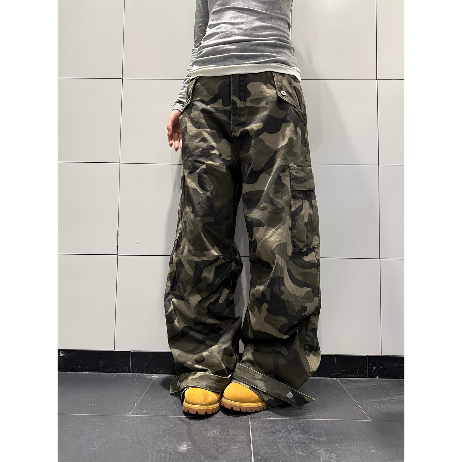 F383 美式复古设计感迷彩工装裤男女高街宽松直筒阔腿弯刀长裤ins - F383
