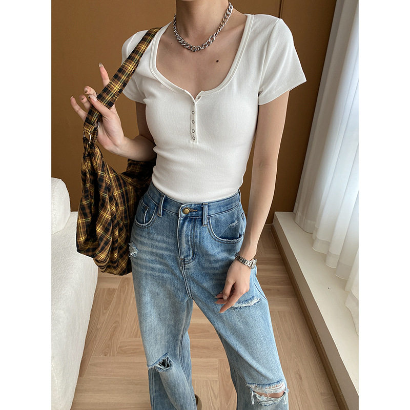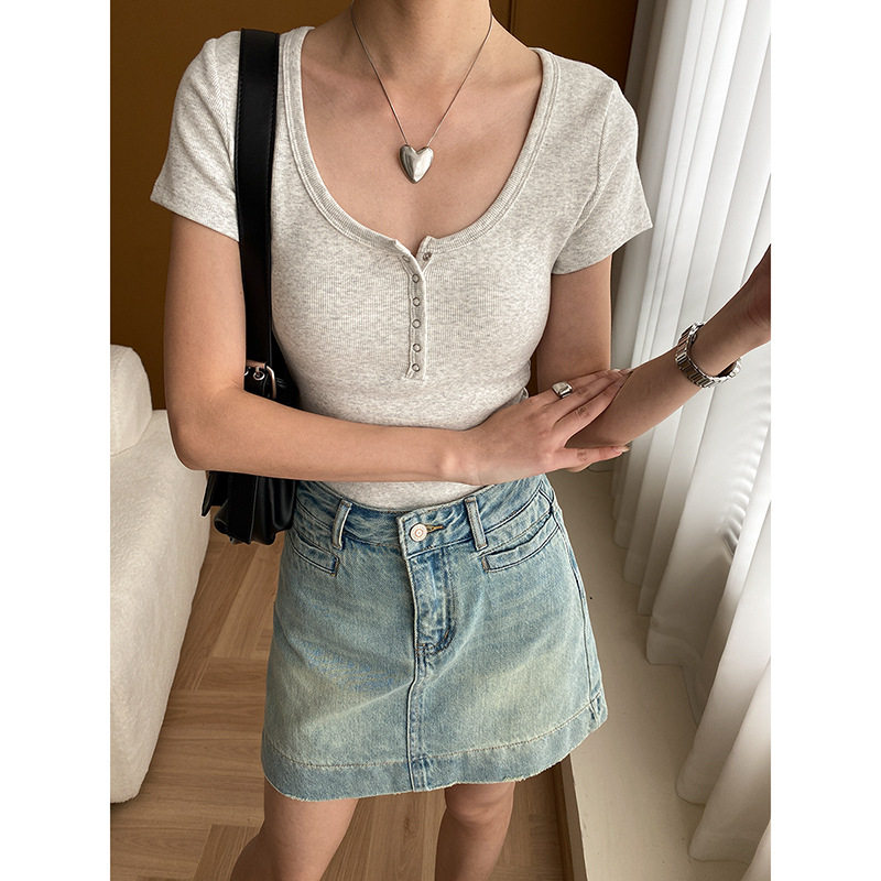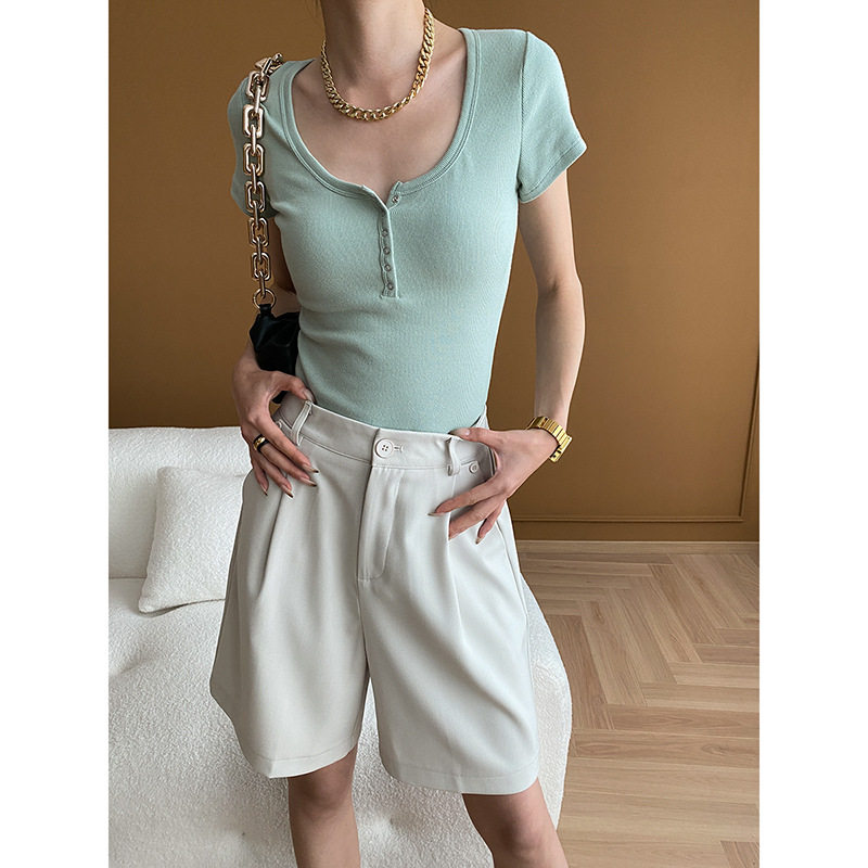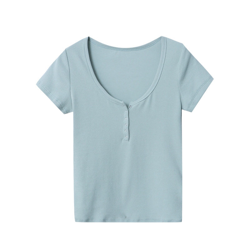 小众设计 简约U领纽扣半门襟正肩修身显瘦短袖T恤 SN5526 - 稿定服饰