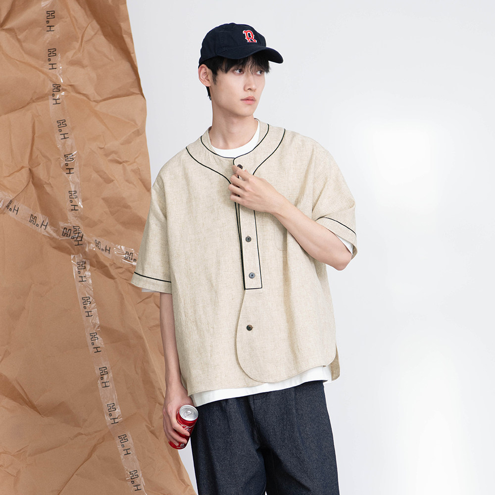 HalfwayHouse原创夏季新款明线日系复古撞色短袖无领休闲T恤衬衫 - HalfwayHouse服饰旗舰店