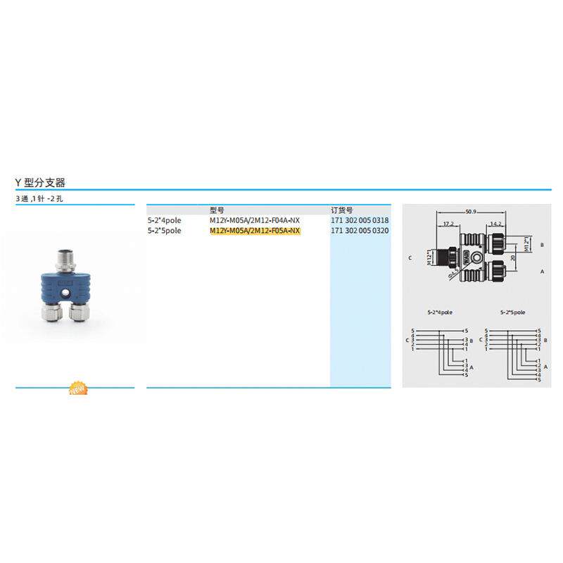 WAIN唯恩M12Y-M05A/2M12-F05A-NX5-2*5pole3通1针-2孔Y型分支器 - 三合顺商贸店1的小店78