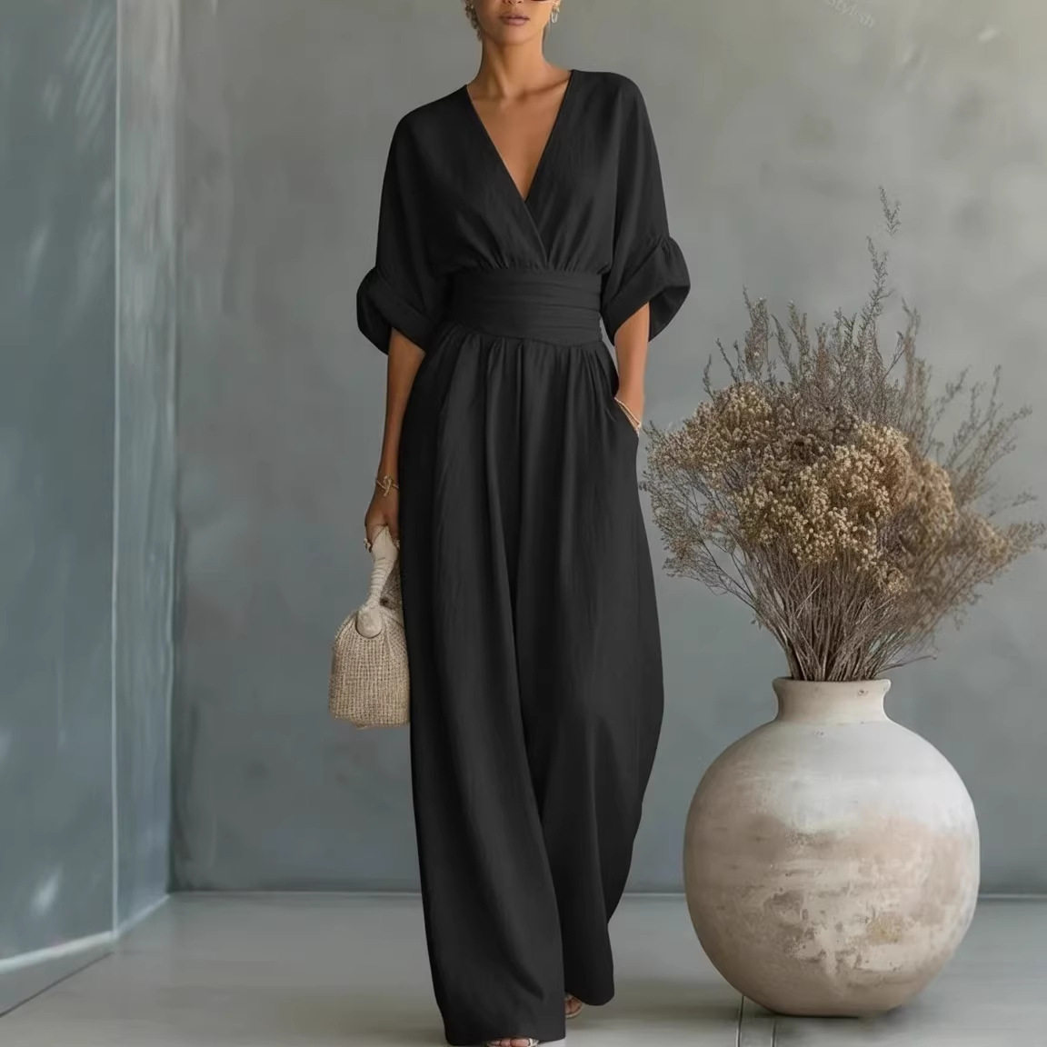 欧美风春夏时尚宽松休闲阔腿裤女收腰V领气质连体裤外贸jumpsuit - Charming美